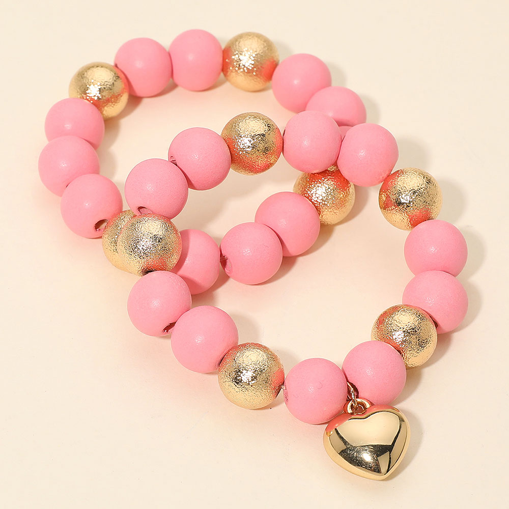 2PCS - Chunky Heart Charm Wooden Metal Ball Beaded Stretch Multi Layered Bracelets