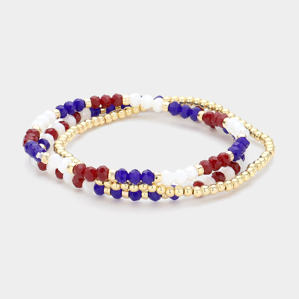 3PCS - American USA Flag Colored Faceted Beaded Stretch Multi Layered Bracelets