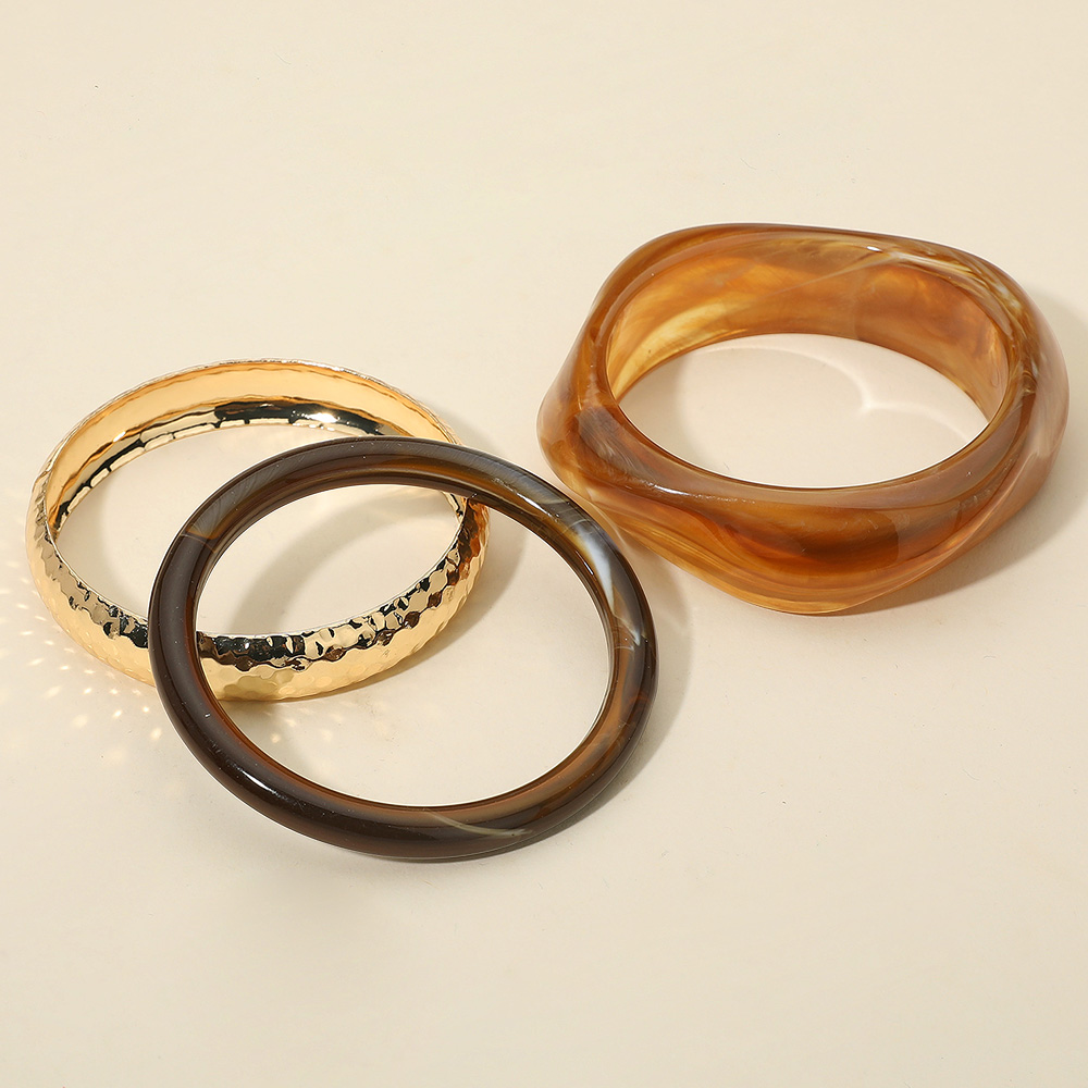 Details • Size : 1.75" H, 25" D • Stylish 3-piece bangle bracelet set featuring a mix of smooth, hammered, and resin finishes for a chic layered look. Perfect for elevating everyday outfits or adding flair to evening wear. Lightweight, versatile, and trendy, this set is a must-have accessory for modern jewelry lovers. • Lead and Nickel Compliant