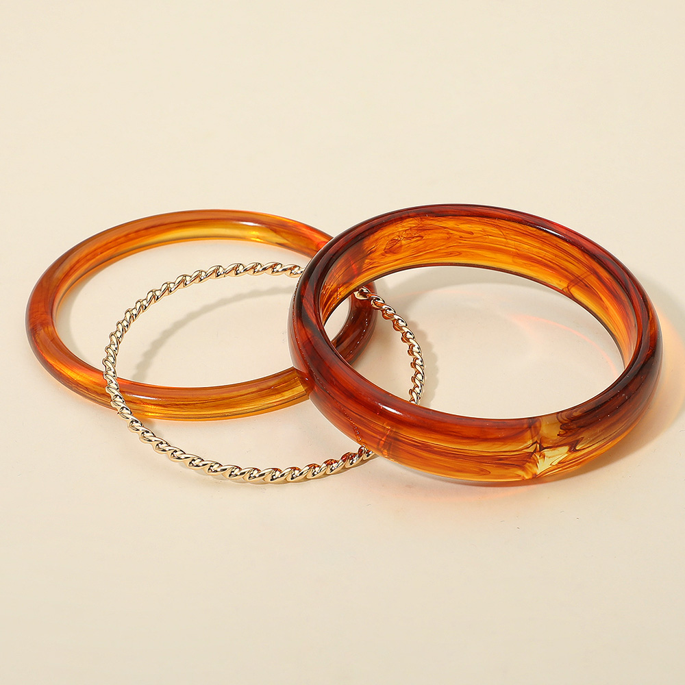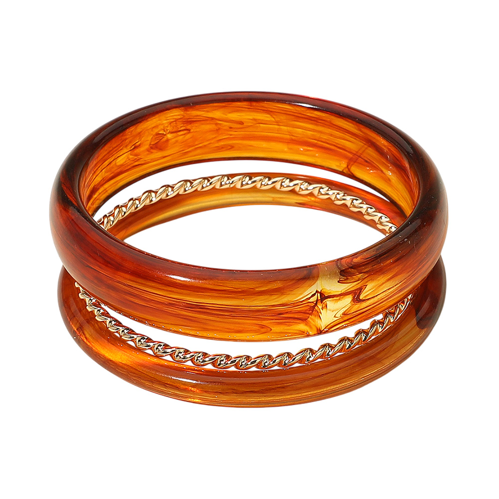 • Elegant 3-piece bangle bracelet set featuring smooth resin textures and a twisted metallic accent. Designed for versatile styling, this layered set can be stacked together or worn separately, adding a refined touch to both casual and dressy outfits.