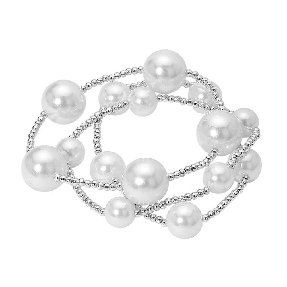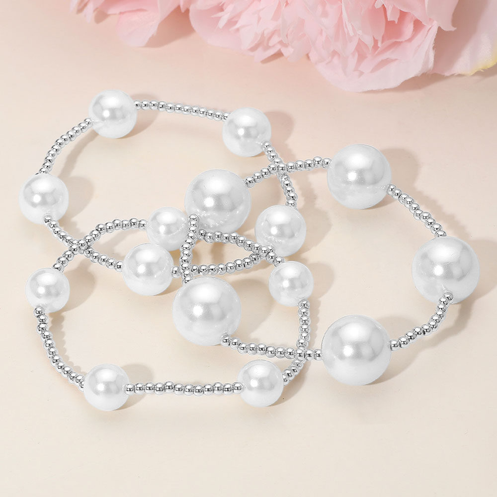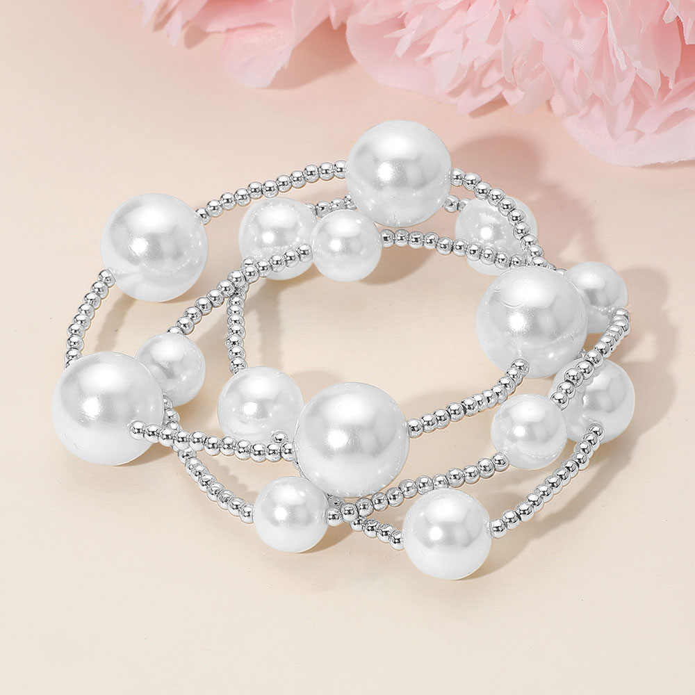 3PCS - Chunky Pearl Accent Metal Ball Beaded Stretch Multi Layered Bracelets