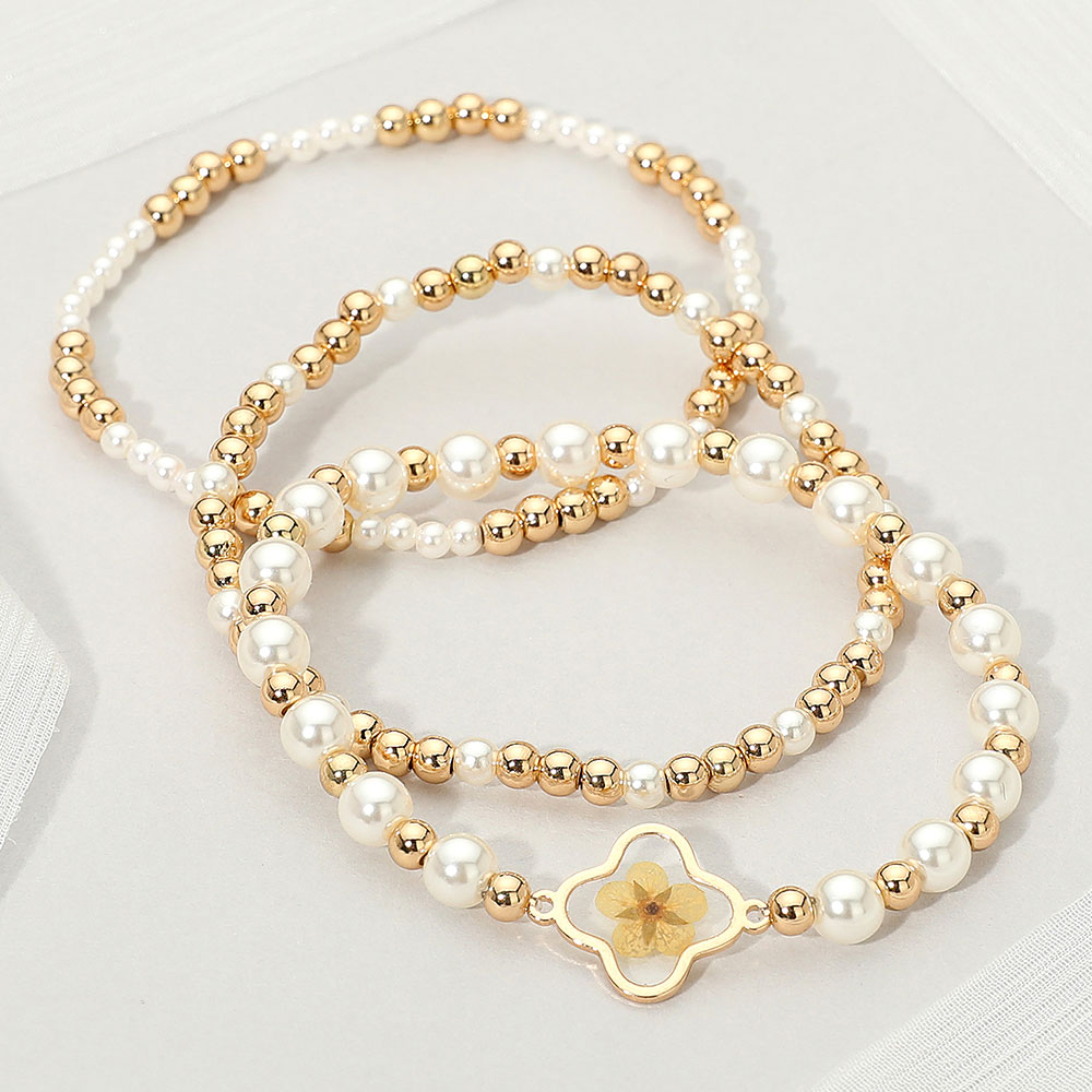 3PCS - Quatrefoil Pearl Beaded Stretch Multi Layered Bracelets