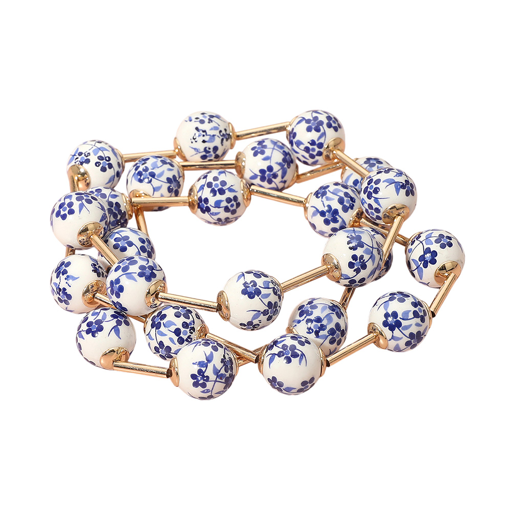 Details • Size : 1.5" H • Stretchable • Adorn your wrist with this blue floral bead bracelet set, showcasing delicate flower-patterned beads connected by gold accents. Lightweight and stylish, this versatile set brings a touch of artistic charm and feminine elegance to casual wear, garden parties, or seasonal fashion outfits. • Lead and Nickel Compliant
