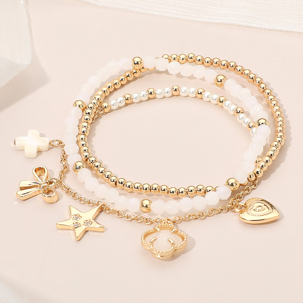3PCS - Quatrefoil Bow Heart Cross Charm Pearl Metal Ball Faceted Beaded Stretch Multi Layered Bracelets