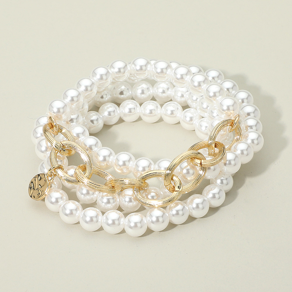 Details • Size : 1.25" H • Stretchable • Refine your look with this triple layer pearl and chain bracelet. Featuring elegant strands of glossy pearls intertwined with textured links, it exudes timeless charm and sophistication—perfect for pairing with formal wear or adding a chic accent to your everyday ensemble. • Lead and Nickel Compliant