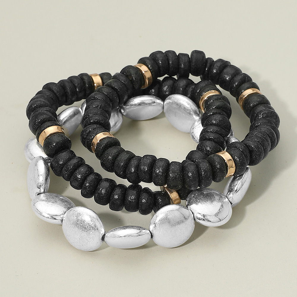 Details • Size : 1.25" H • Stretchable • This stretch bracelet set features a bold mix of smooth and textured beads paired with metallic accents, offering a versatile layered style. Perfect for stacking or wearing individually, these bracelets add a modern touch to casual outfits and elevate your look for any occasion. • Lead and Nickel Compliant