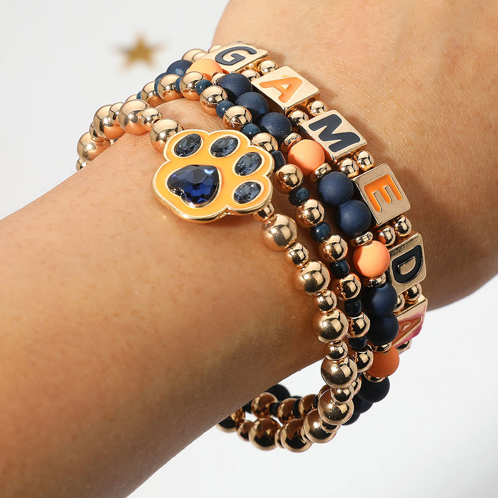 • Show your team spirit with this set of stackable game day bracelets featuring bold beaded designs, letter accents, and paw charms. Perfect for sports fans, these trendy stretch bracelets are lightweight, versatile, and great for layering on game day or every day wear.