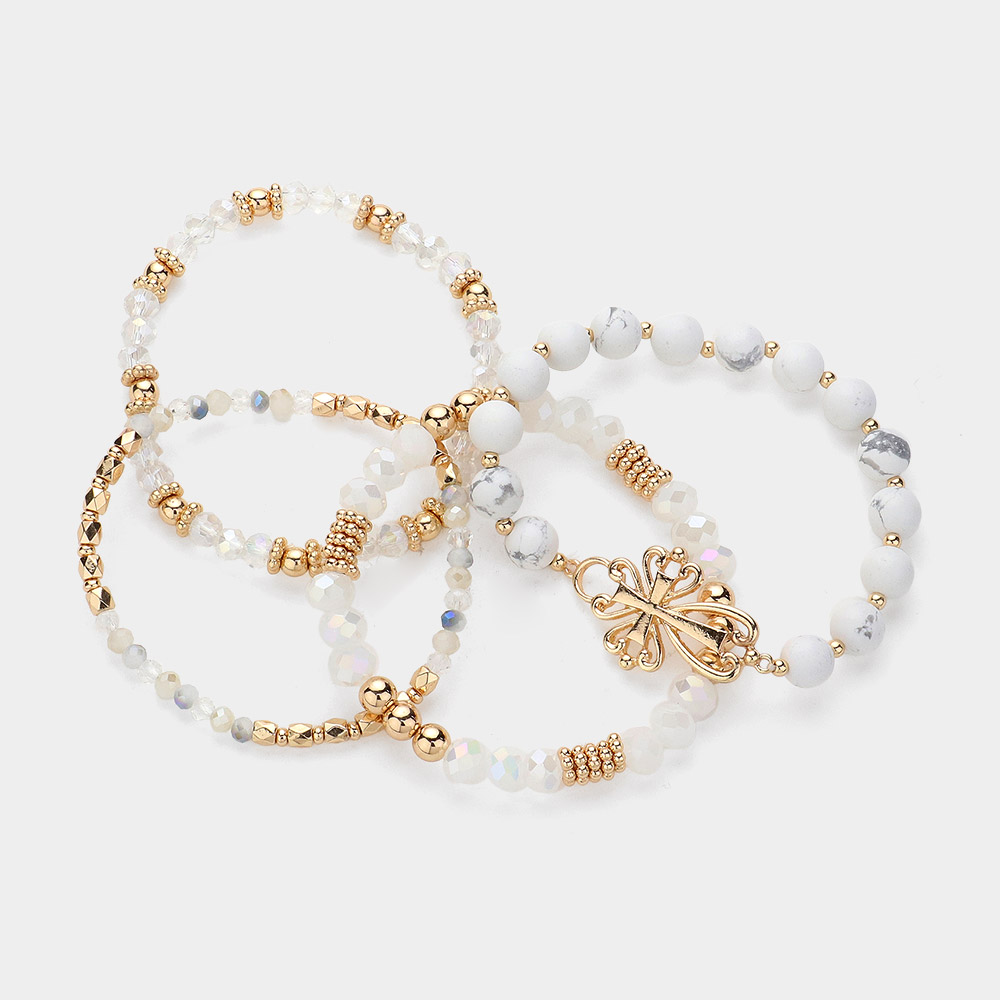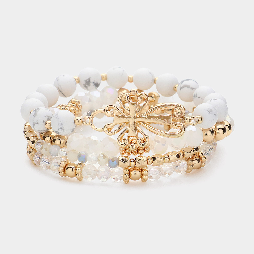 4PCS - Metal Cross Pendant Accented Faceted Beads Natural Stone Beaded Stretch Multi Layered Bracelets