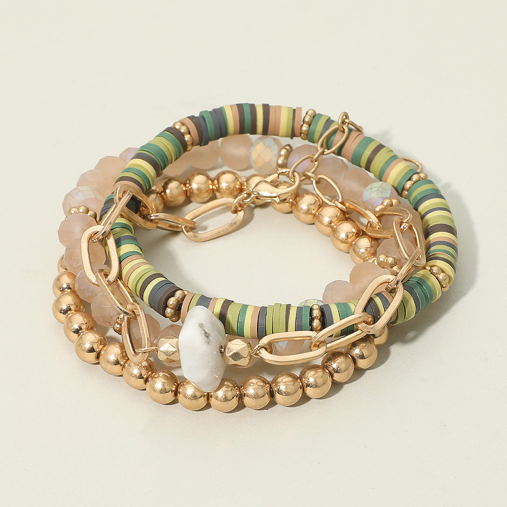 Details • Size 1 : 0.7" H, 7" L + 1.5" L/ Lobster Clasp Closure • Size 2 : 0.25" H, 0.3"H / Stretchable • Make a bold statement with this layered bracelet set combining smooth beads, colorful accents, chain details, and a unique stone centerpiece. Its playful yet chic design offers versatility, perfect for stacking or wearing alone to complement everyday and special occasion outfits. • Lead and Nickel Compliant
