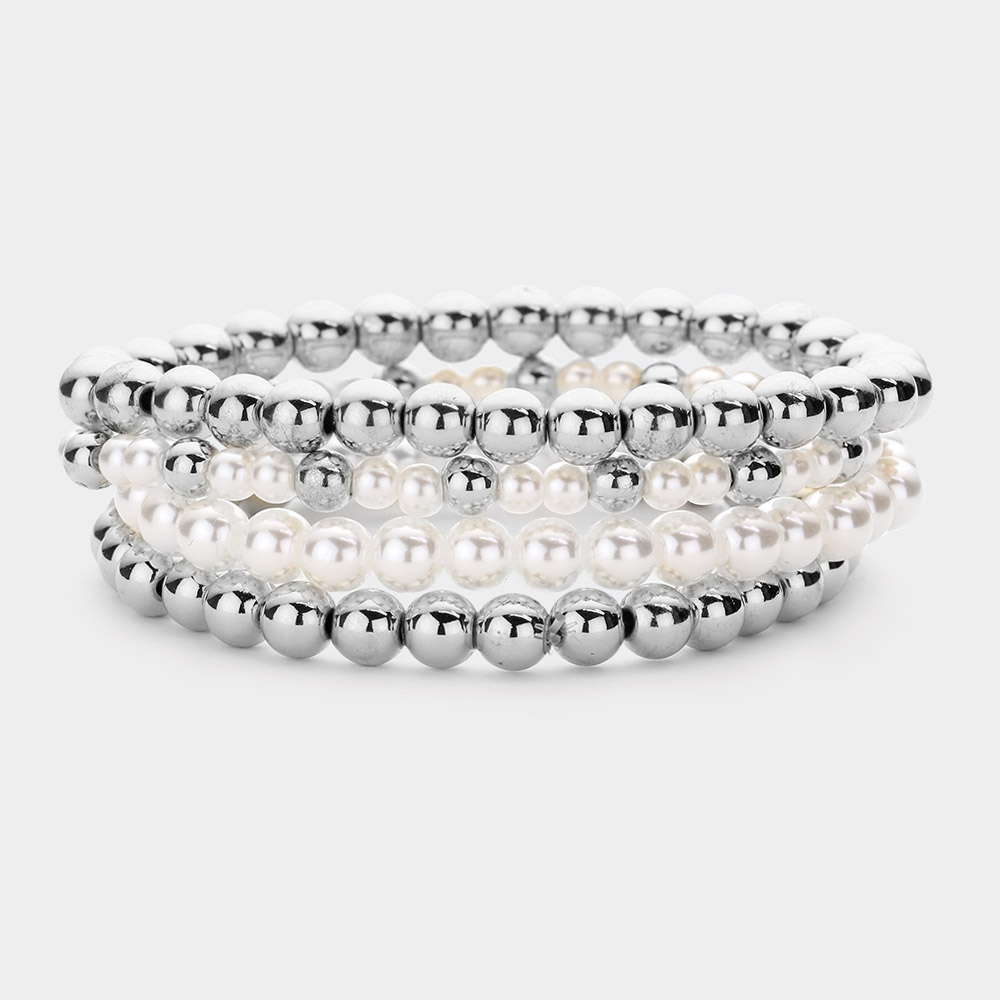 Alternating Metal Pearl Beaded Stretch Statement Bracelet