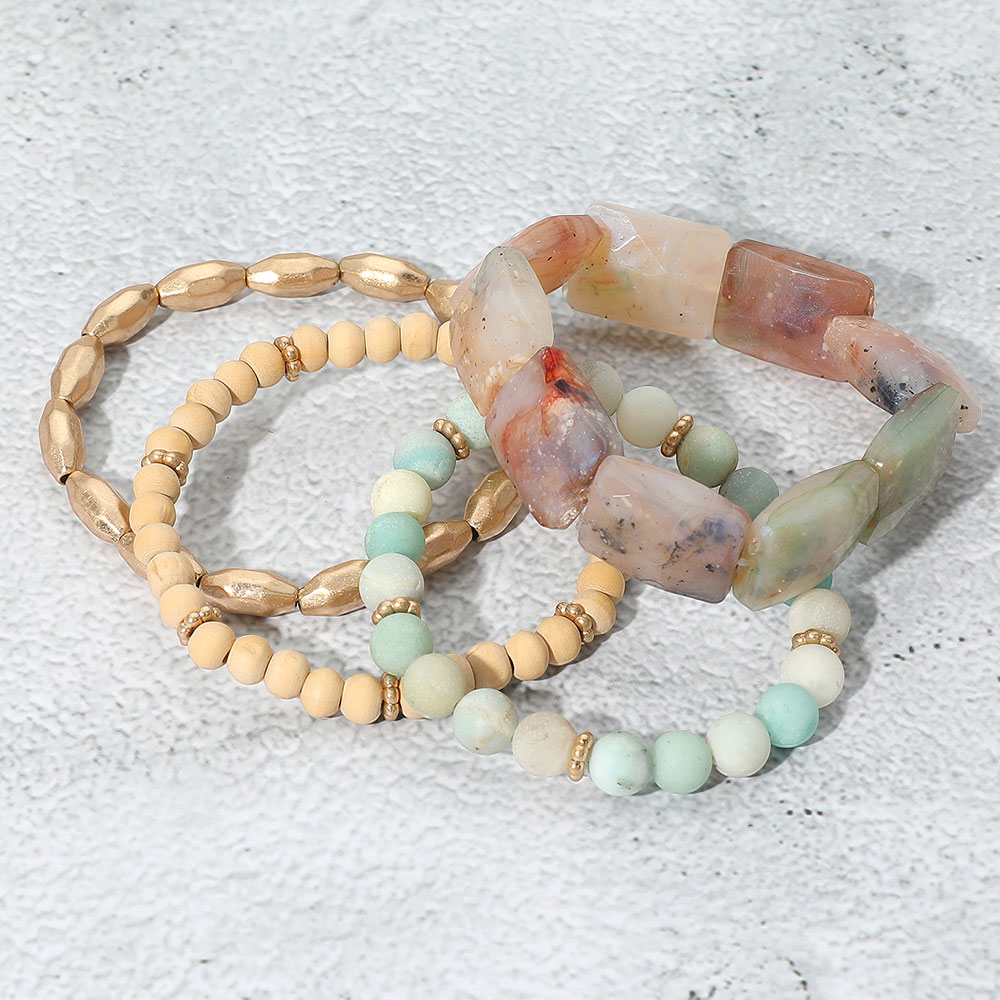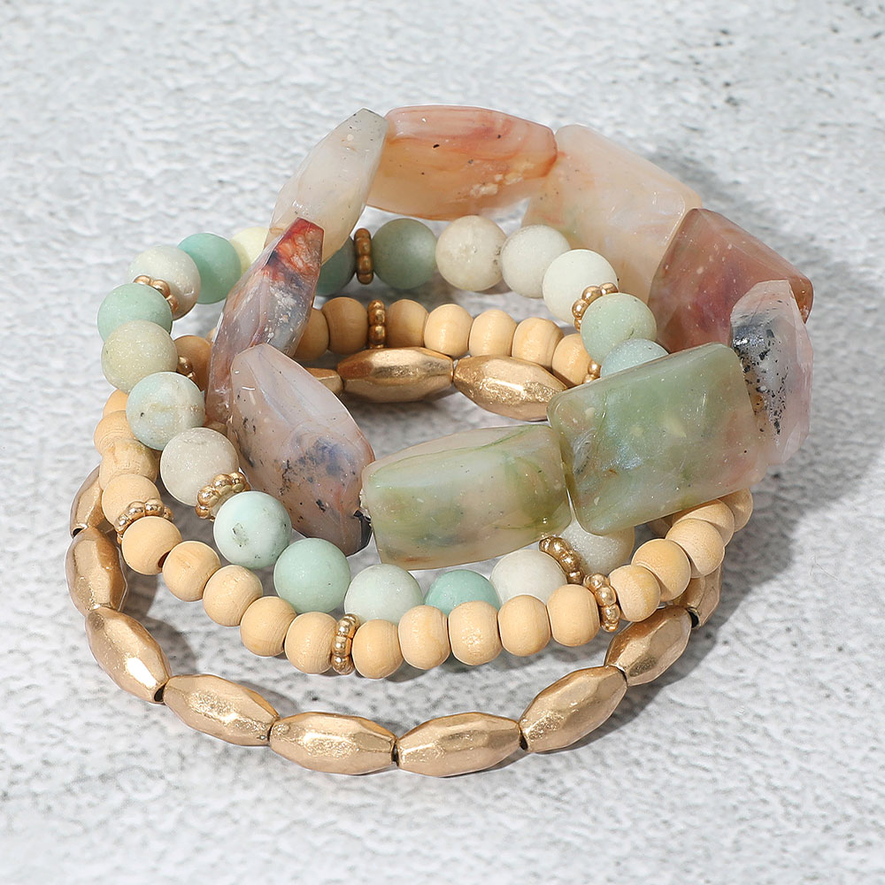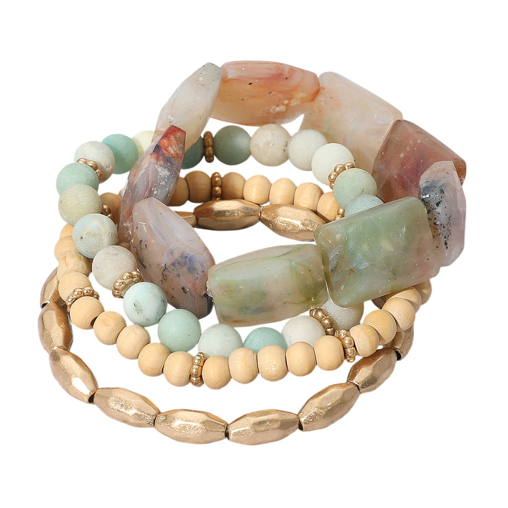 Details • Size : 1.4" H • Stretchable • Stylish stretch bracelet stack featuring bold natural stone shapes and mixed textures. Lightweight and flexible design, ideal for casual or statement wear. • Lead and Nickel Compliant