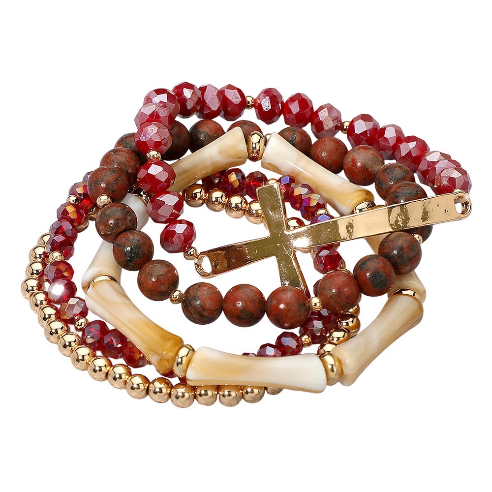 5PCS - Metal Cross Accent Resin Bamboo Bar Faceted Beaded Stretch Multi Layered Bracelets