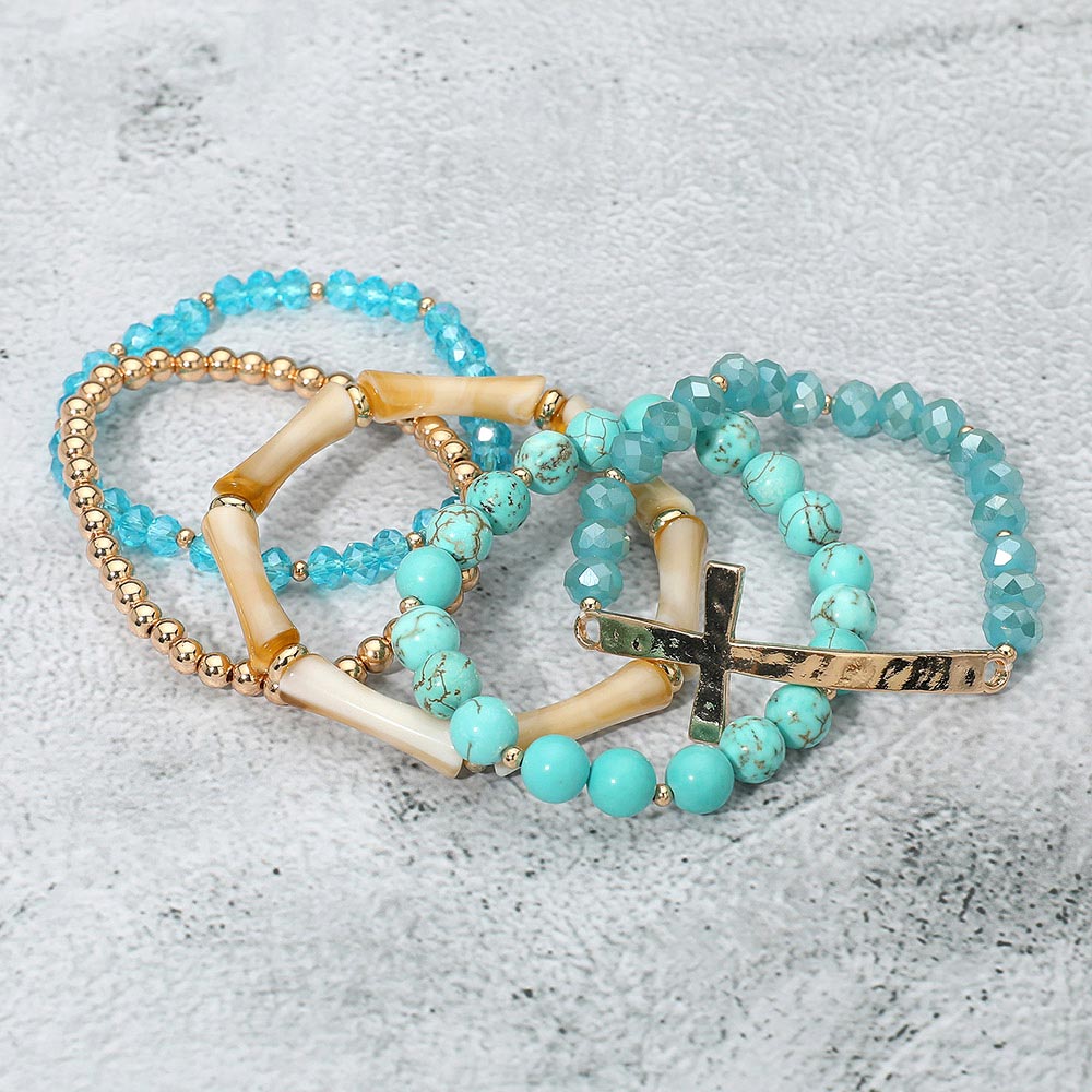 5PCS - Metal Cross Accent Resin Bamboo Bar Faceted Beaded Stretch Multi Layered Bracelets