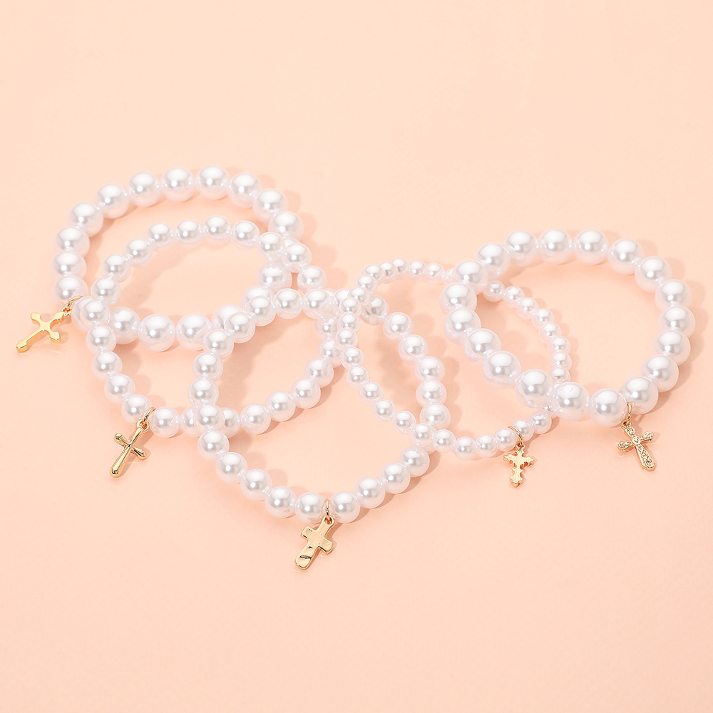Details • Size : 1.8" H • Charm Size : 0.5" X 0.7" • Stretchable • This multi-strand stretch bracelet features glossy pearl-inspired beads paired with delicate cross charms for a refined, meaningful touch. Its layered, graceful design adds sophistication to any look, making it a beautiful accessory for both everyday wear and special occasions. • Lead and Nickel Compliant