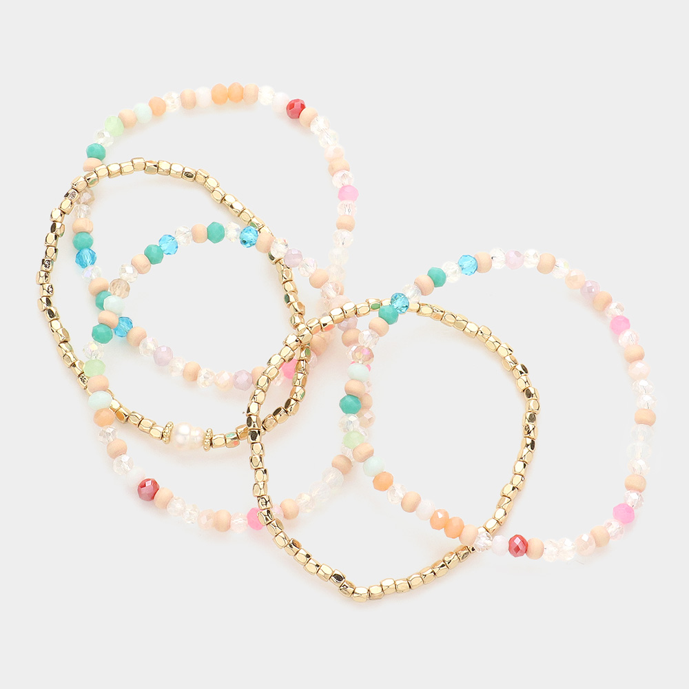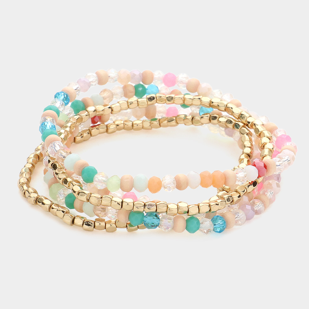 2PCS - Mixed Flat Wood Metal Faceted Beaded Stretch Multi Layered Bracelets