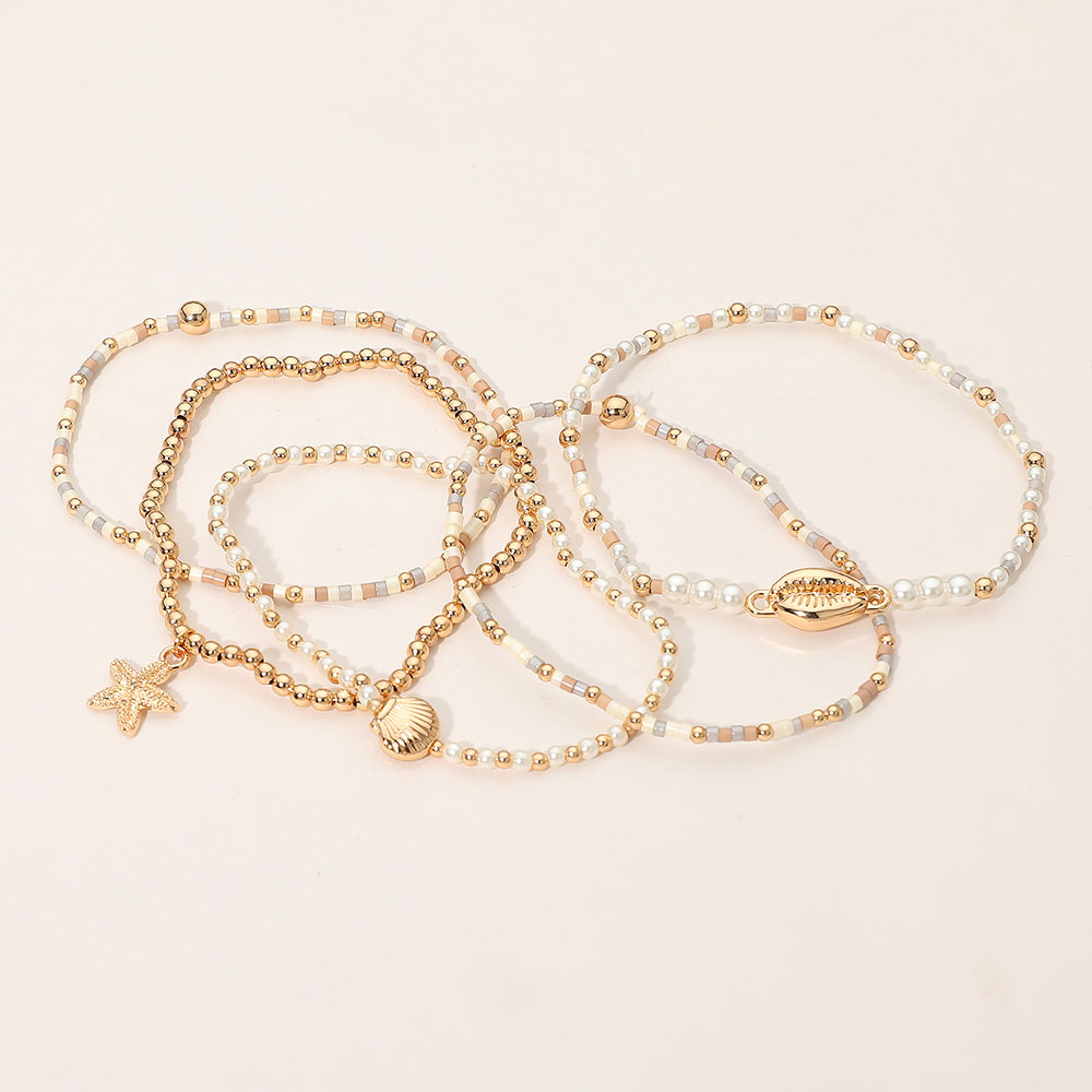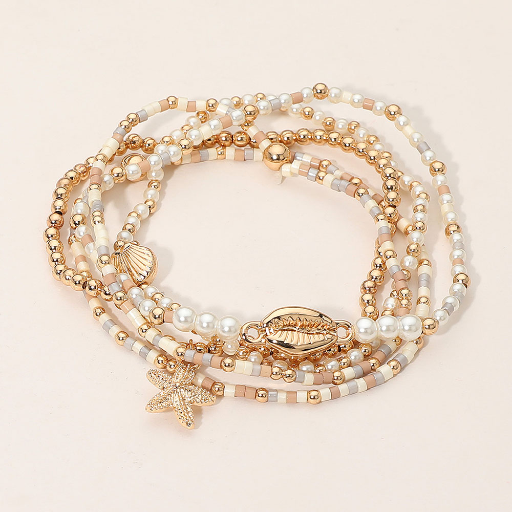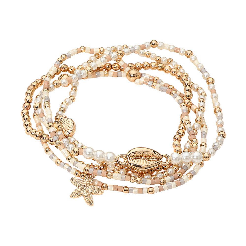 5PCS - Starfish Seashell Charm Pearl Seed Beaded Stretch Multi Layered Bracelets
