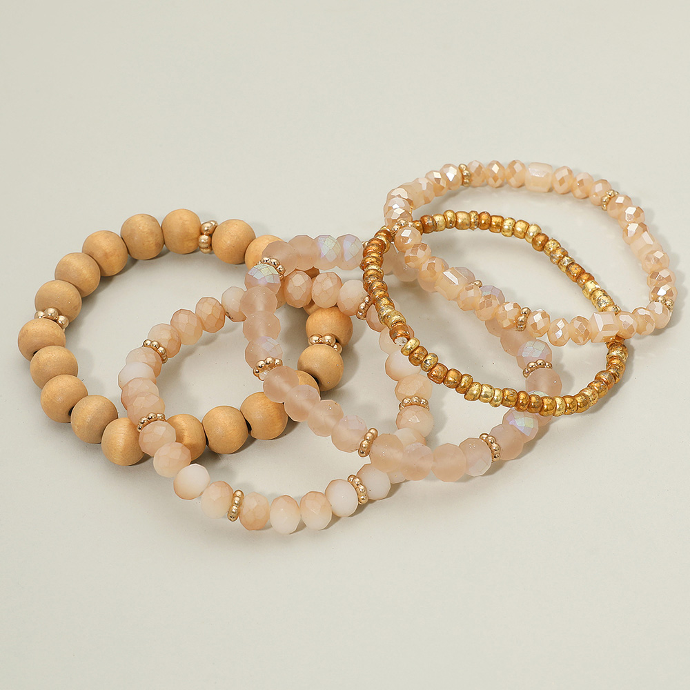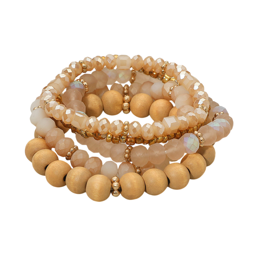 Details • Size : 1.5" H • Stretchable • This stretch bracelet set features a mix of smooth wooden beads and faceted glass accents, designed for versatile everyday wear. With multiple strands to stack together or wear separately, this set offers a chic and lightweight accessory to elevate any outfit. • Lead and Nickel Compliant