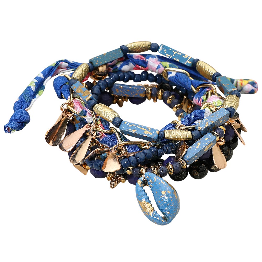 Details • Size 1 : 1.25" H / Stretchable • Size 2 : 1" H / Adjustable • Create a beach-inspired look with this layered boho bracelet set featuring mixed blue beads, floral fabric ties, gold-tone teardrop charms, and a standout seashell accent. Each bracelet offers unique textures and coastal flair that can be worn together as a bold stack or individually for a more subtle style. Perfect for vacation outfits, summer festivals, and everyday statement accessorizing. • Lead and Nickel Compliant • Made In India