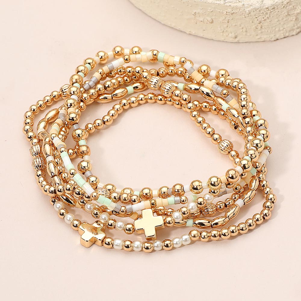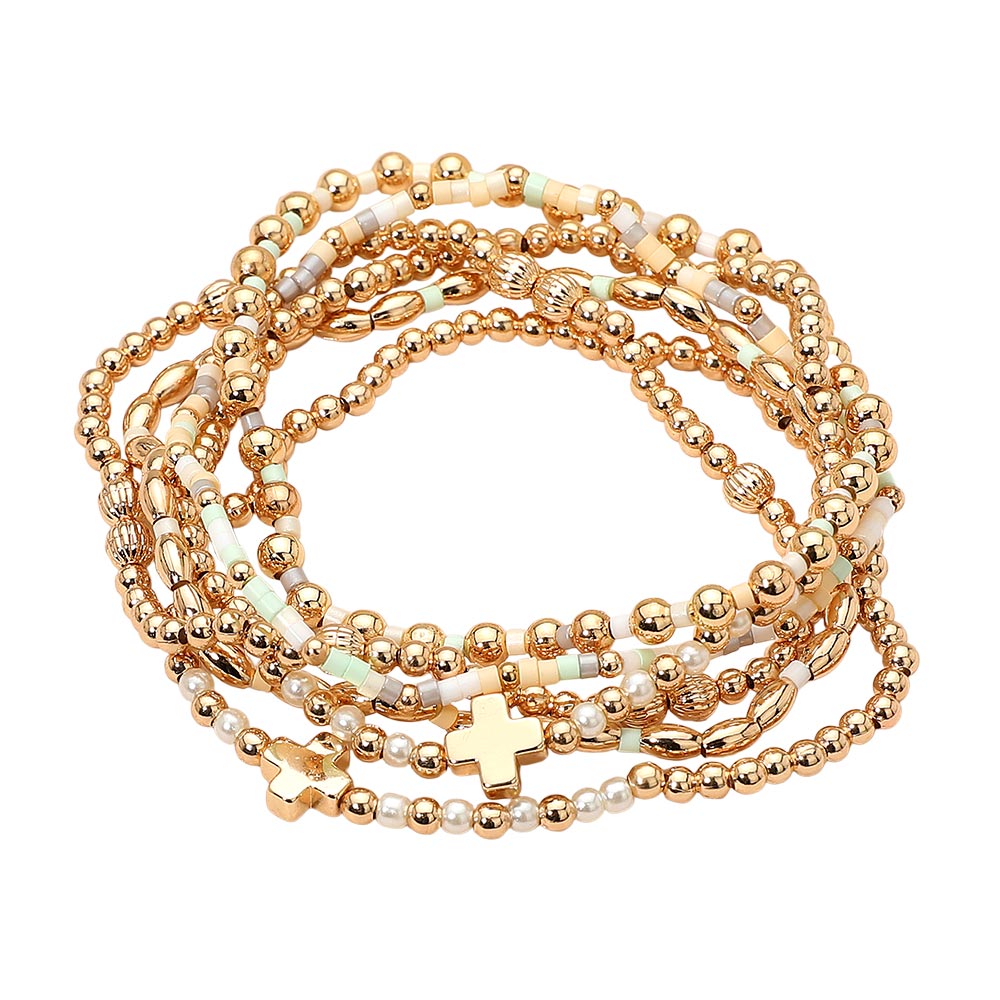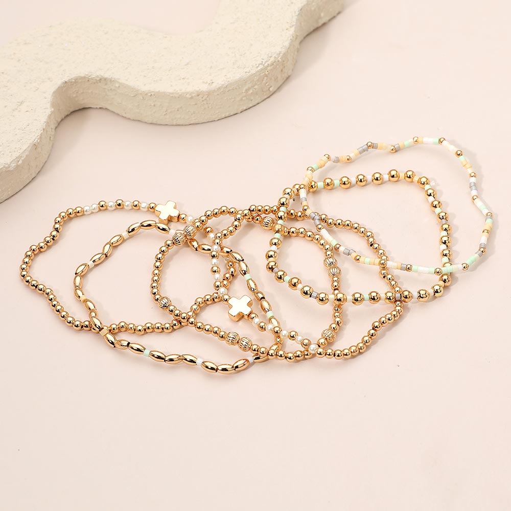 6PCS - Cross Charm Accent Seed Beaded Stretch Multi Layered Bracelets