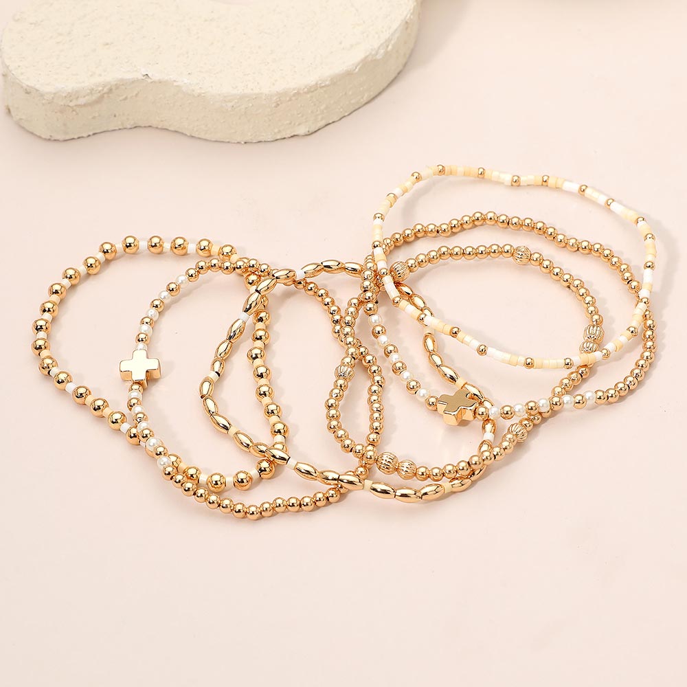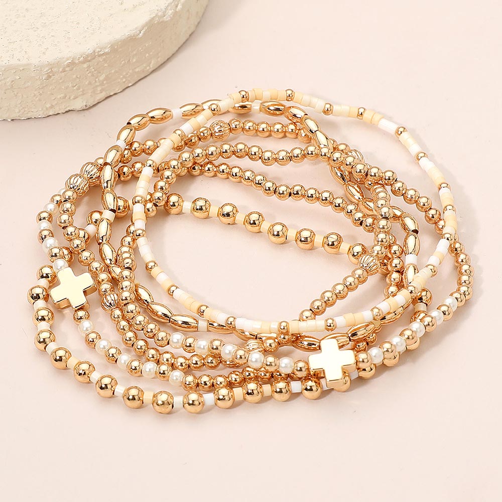 6PCS - Cross Charm Accent Seed Beaded Stretch Multi Layered Bracelets