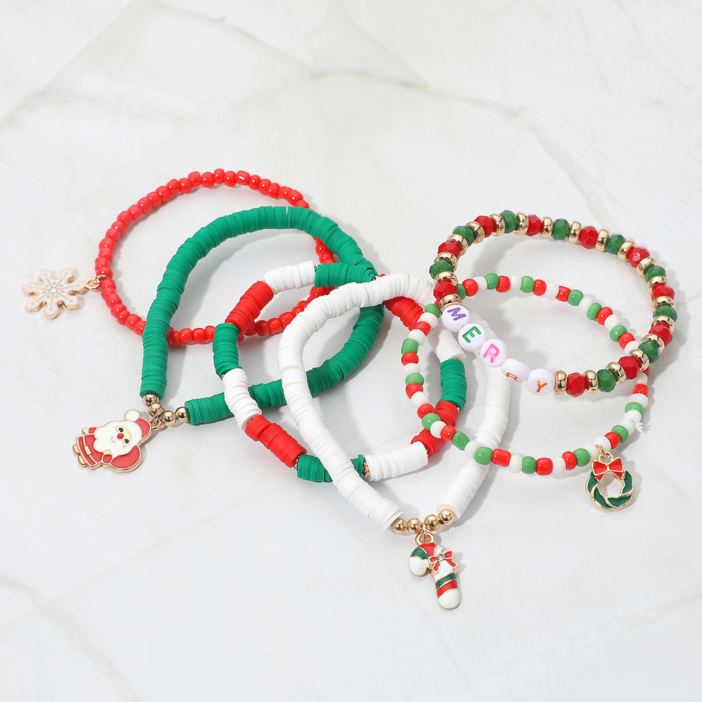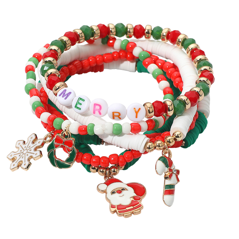 Details • Size : 2.25" H • Stretchable • Celebrate the holidays with this Merry Christmas beaded bracelet set featuring festive colors and fun charms like Santa, snowflake, wreath, and candy cane. A joyful seasonal accessory perfect for parties, gifting, or everyday holiday wear, bringing festive cheer to every outfit. • Lead and Nickel Compliant