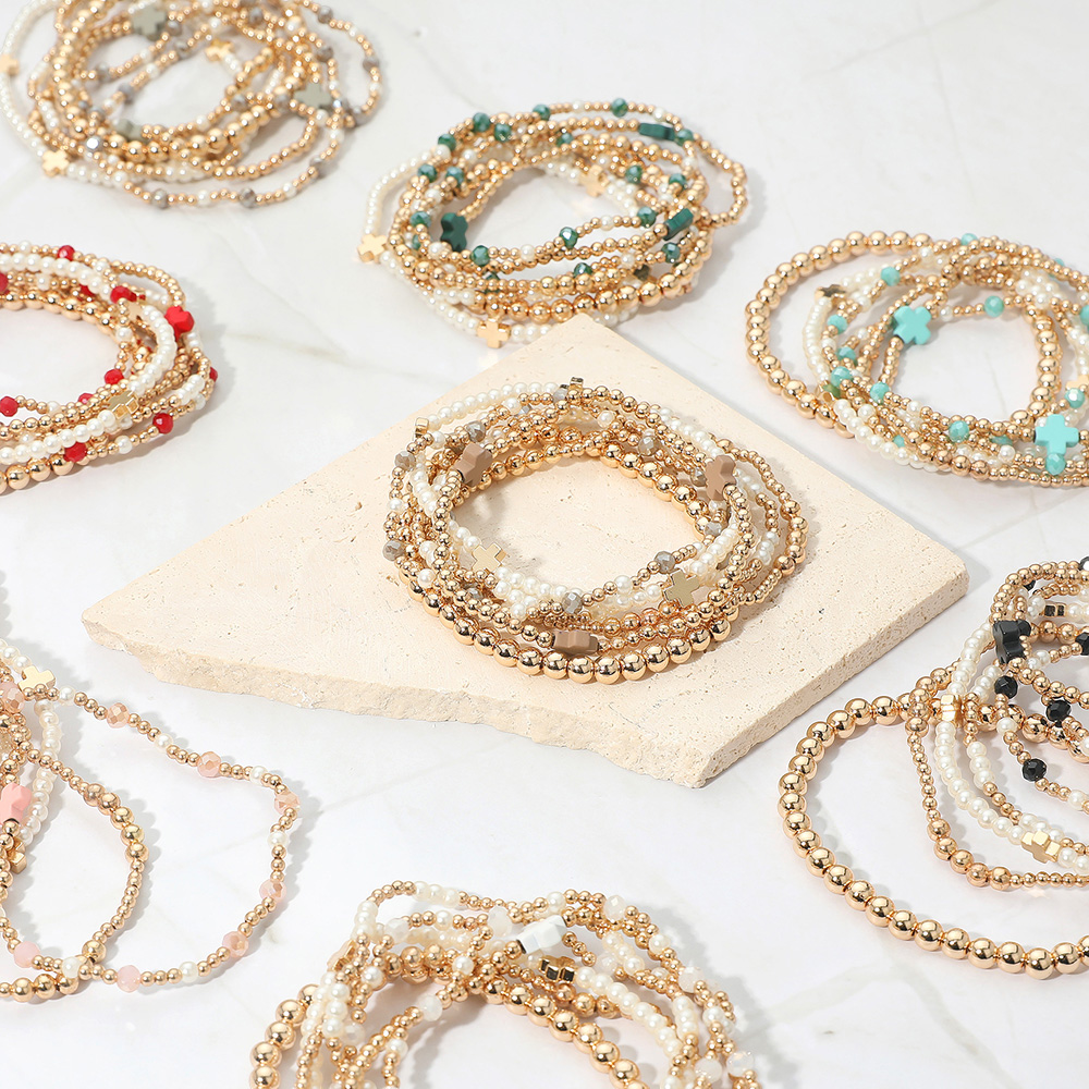 7PCS - Cross Pearl Metal Ball Beaded Stretch Multi Layered Bracelets