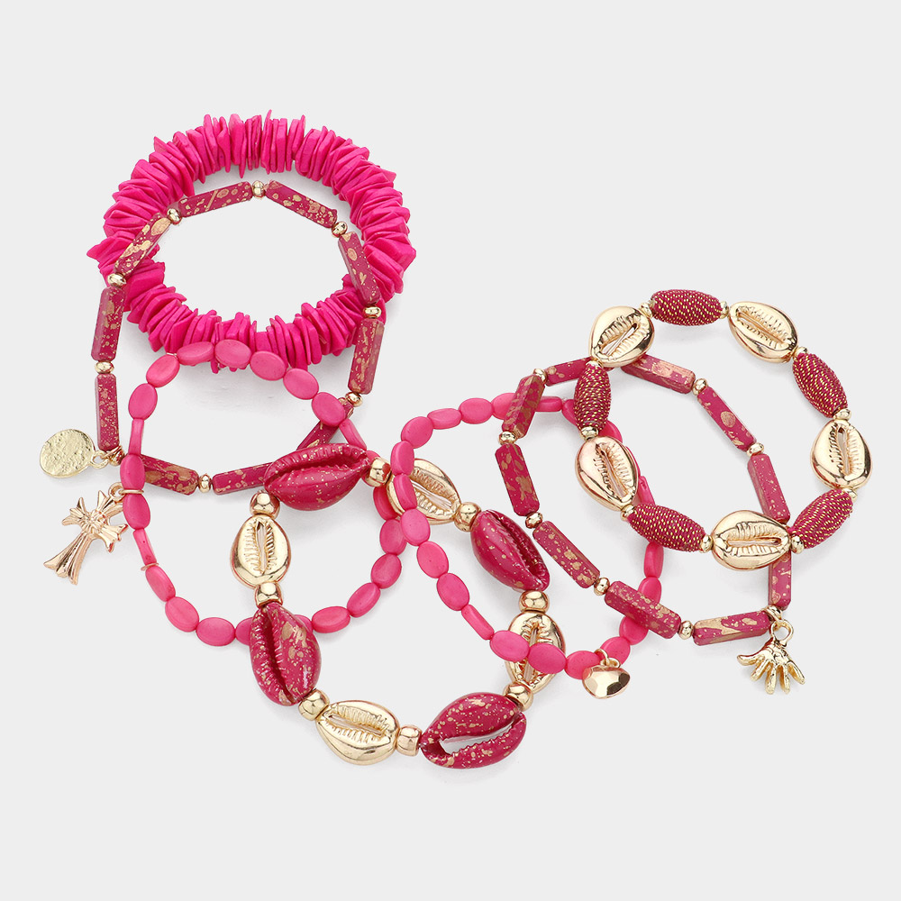 7PCS - Metal Cross Hammered Disc Charm Puka Shell Beads Accented Faceted Beaded Multi Layered Bracelets
