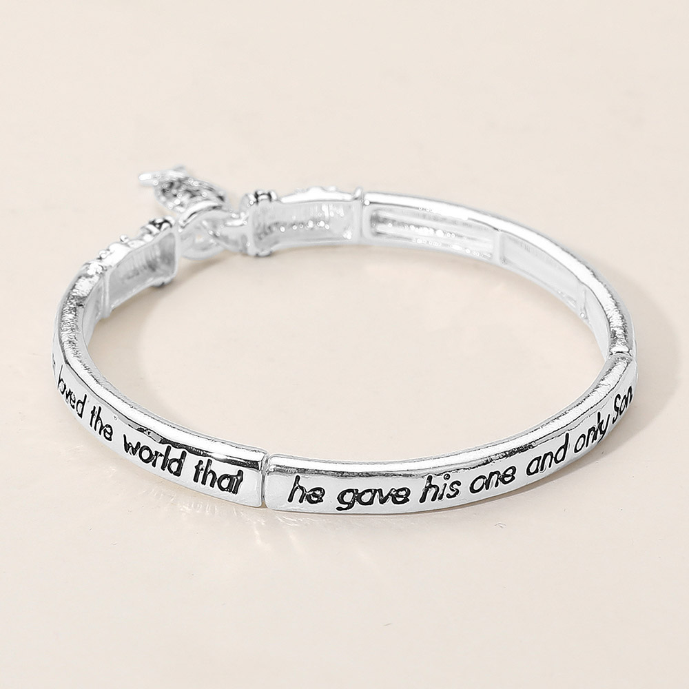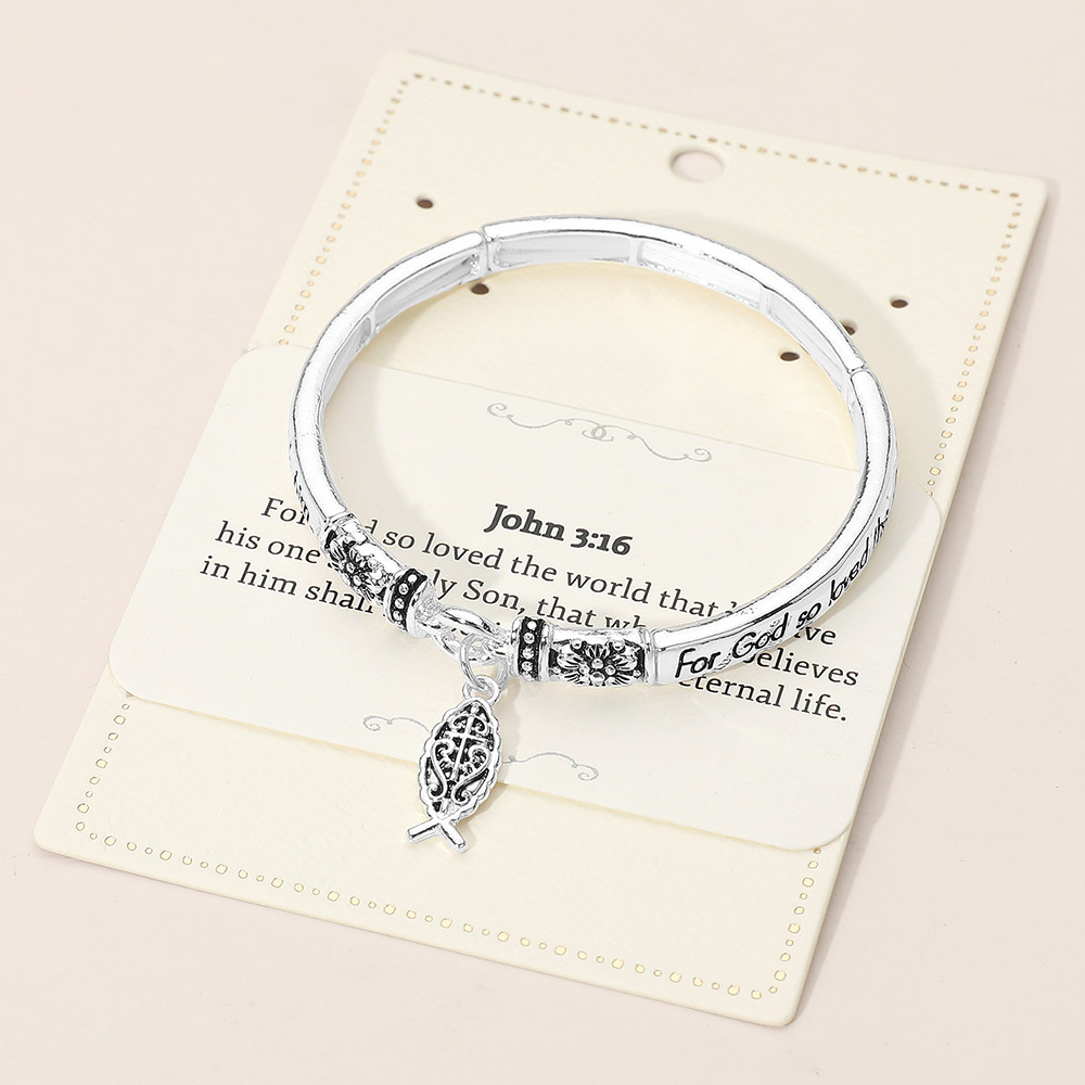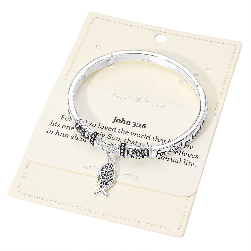 Details • Size : 0.25" H, 2.4" D • Charm Size : 0.75" L • Stretchable • Celebrate faith with this elegant bangle bracelet featuring the inspiring verse John 3:16 and a symbolic charm. Designed to remind you of divine love and eternal hope, it makes a meaningful accessory or heartfelt gift for anyone seeking daily encouragement and spiritual reflection. • Lead and Nickel Compliant
