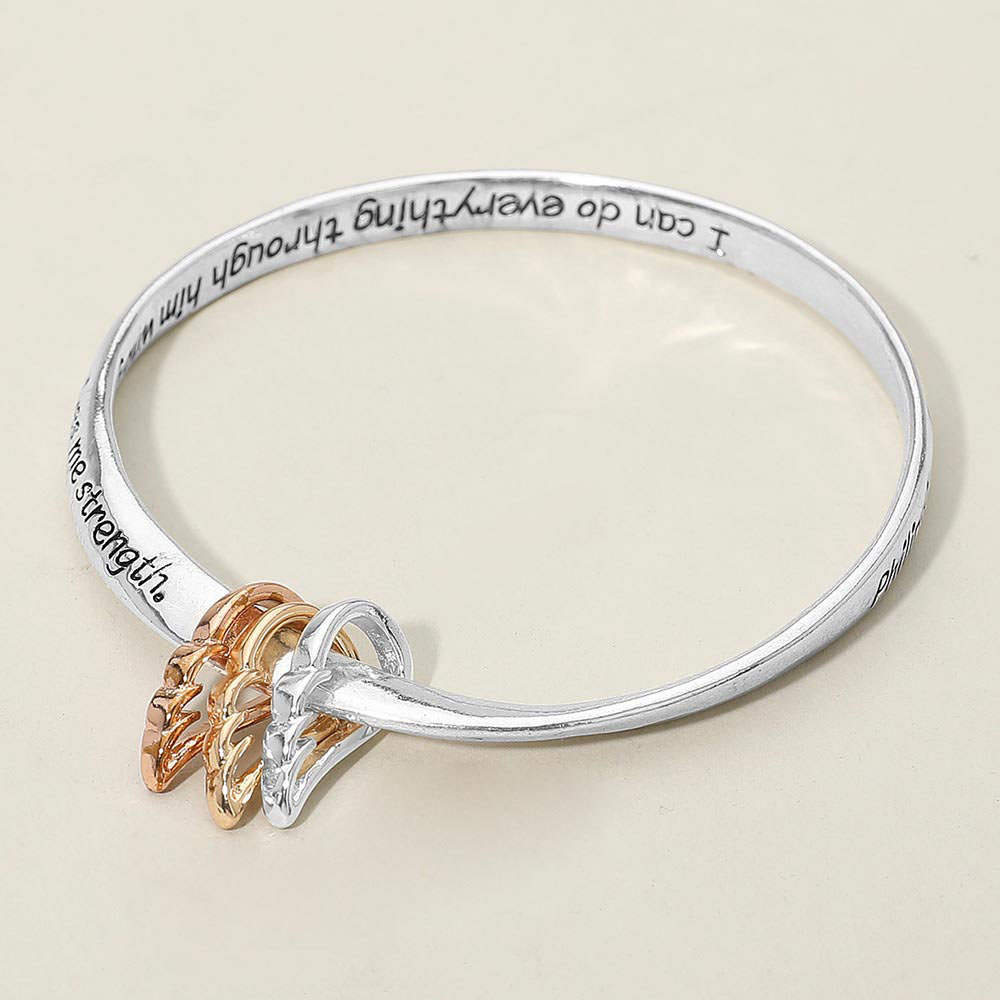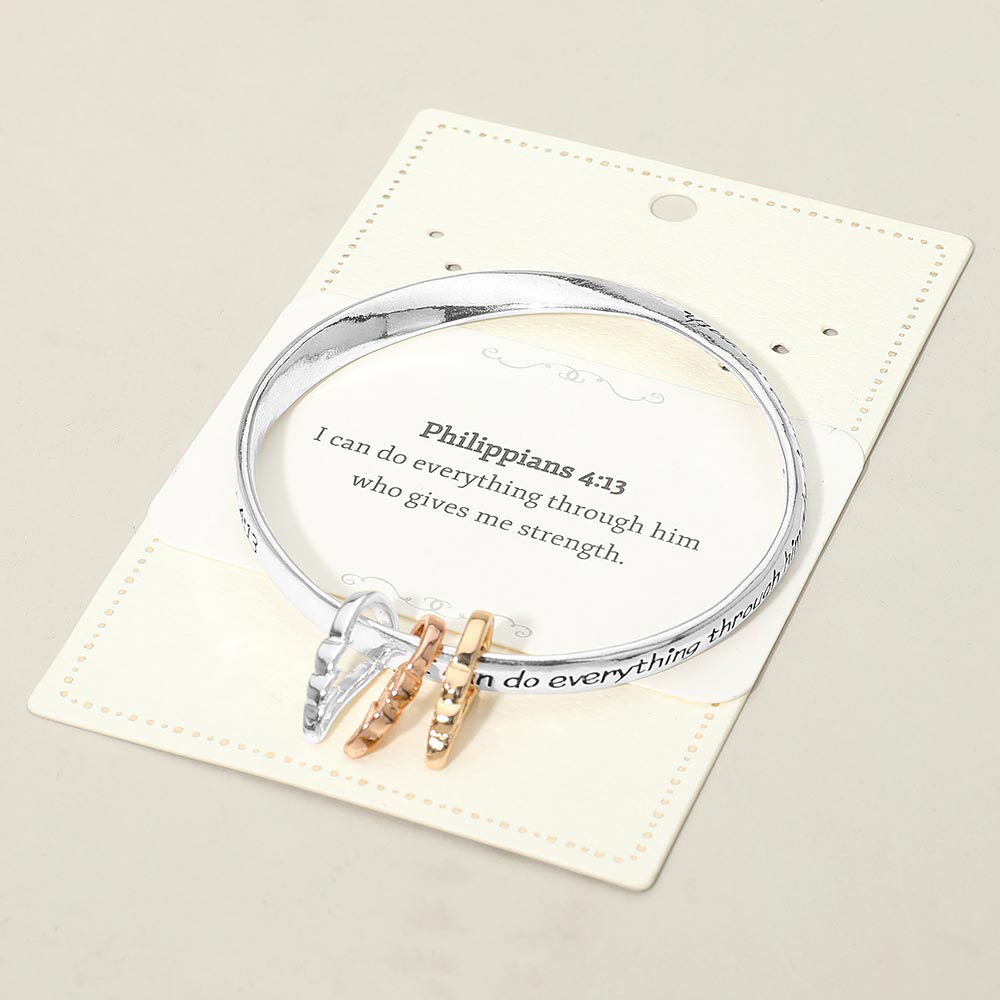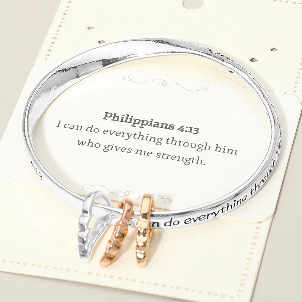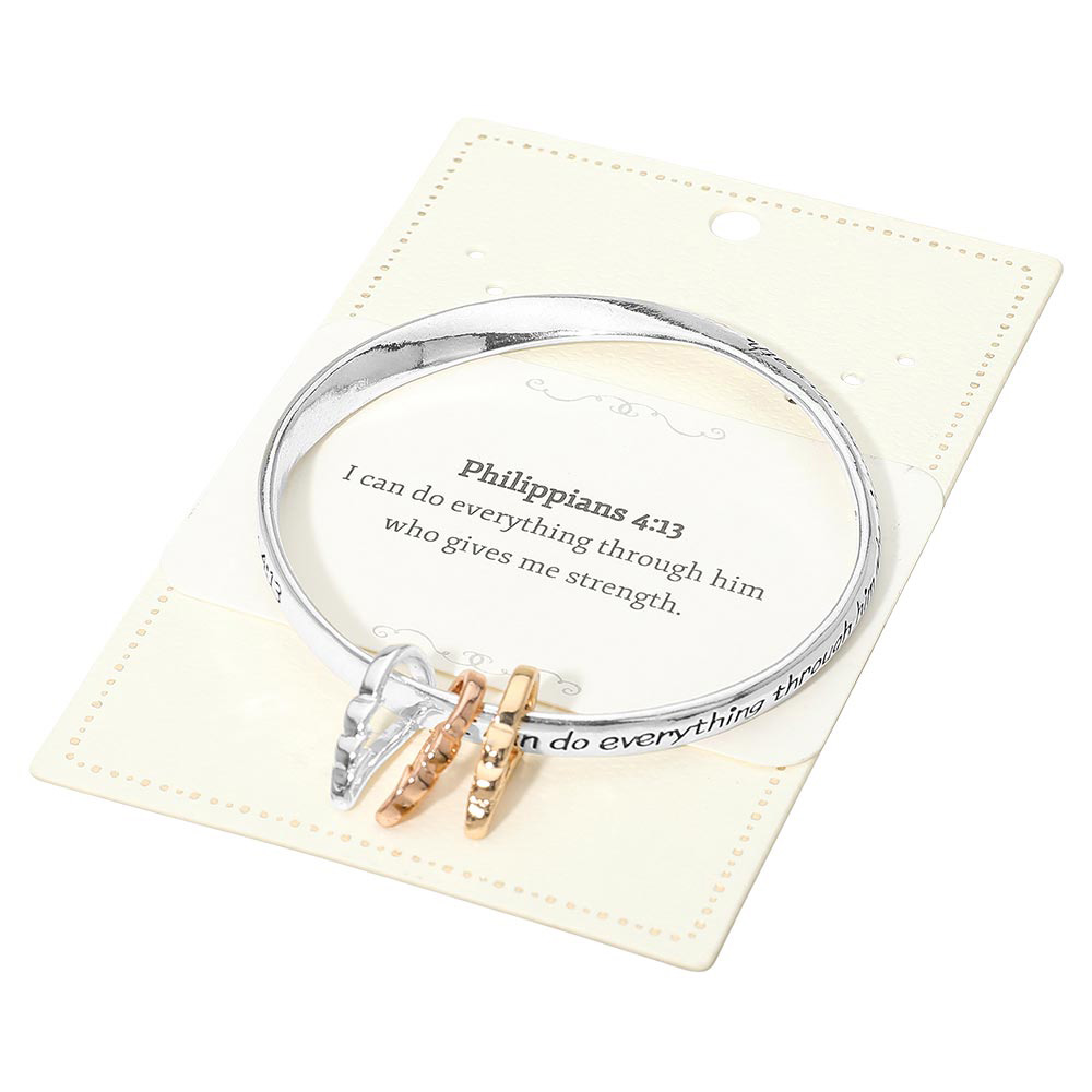 Details • Size : 0.75" H, 2.5" D • Stay inspired with this Philippians 4:13 engraved scripture bangle bracelet featuring a meaningful message and delicate accent charms. Perfect for daily wear, faith-centered gifting, or special occasions, it offers a stylish way to carry strength, hope, and encouragement wherever you go. • Lead and Nickel Compliant
