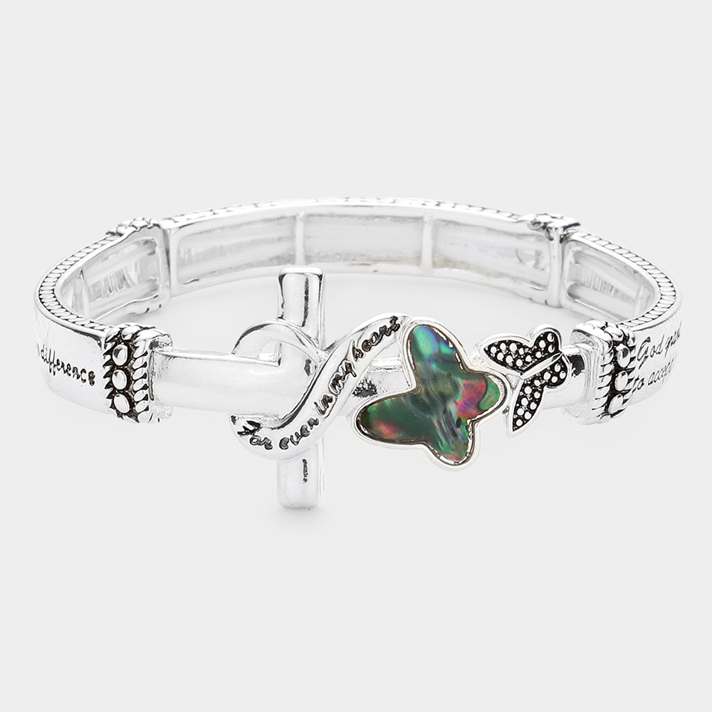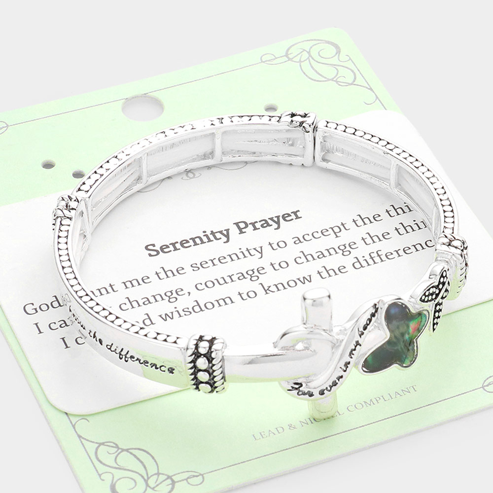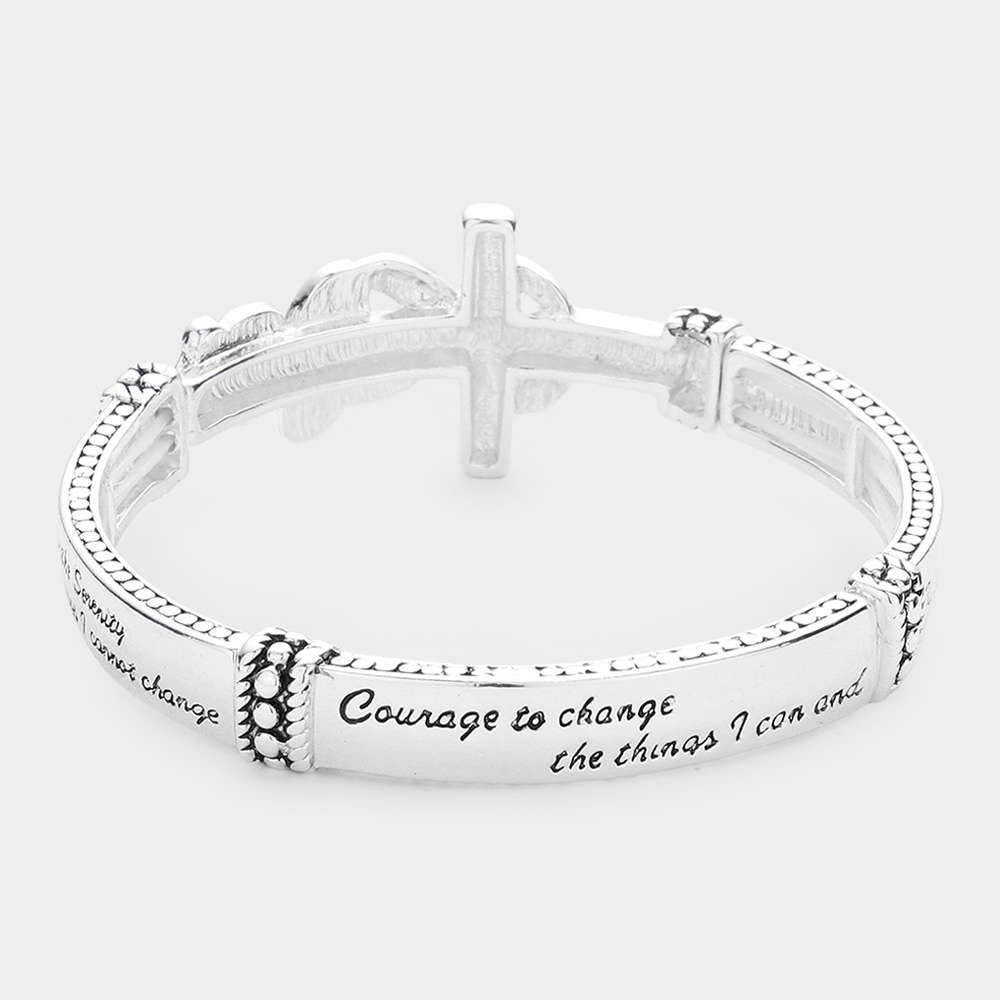 Details • Size : 0.8" H • Stretchable • Embrace peace and faith with this serenity prayer bracelet featuring meaningful dove and cross accents. Its stretch design ensures comfort and ease, making it a heartfelt reminder of strength, hope, and spiritual calm in everyday moments. • Lead and Nickel Compliant