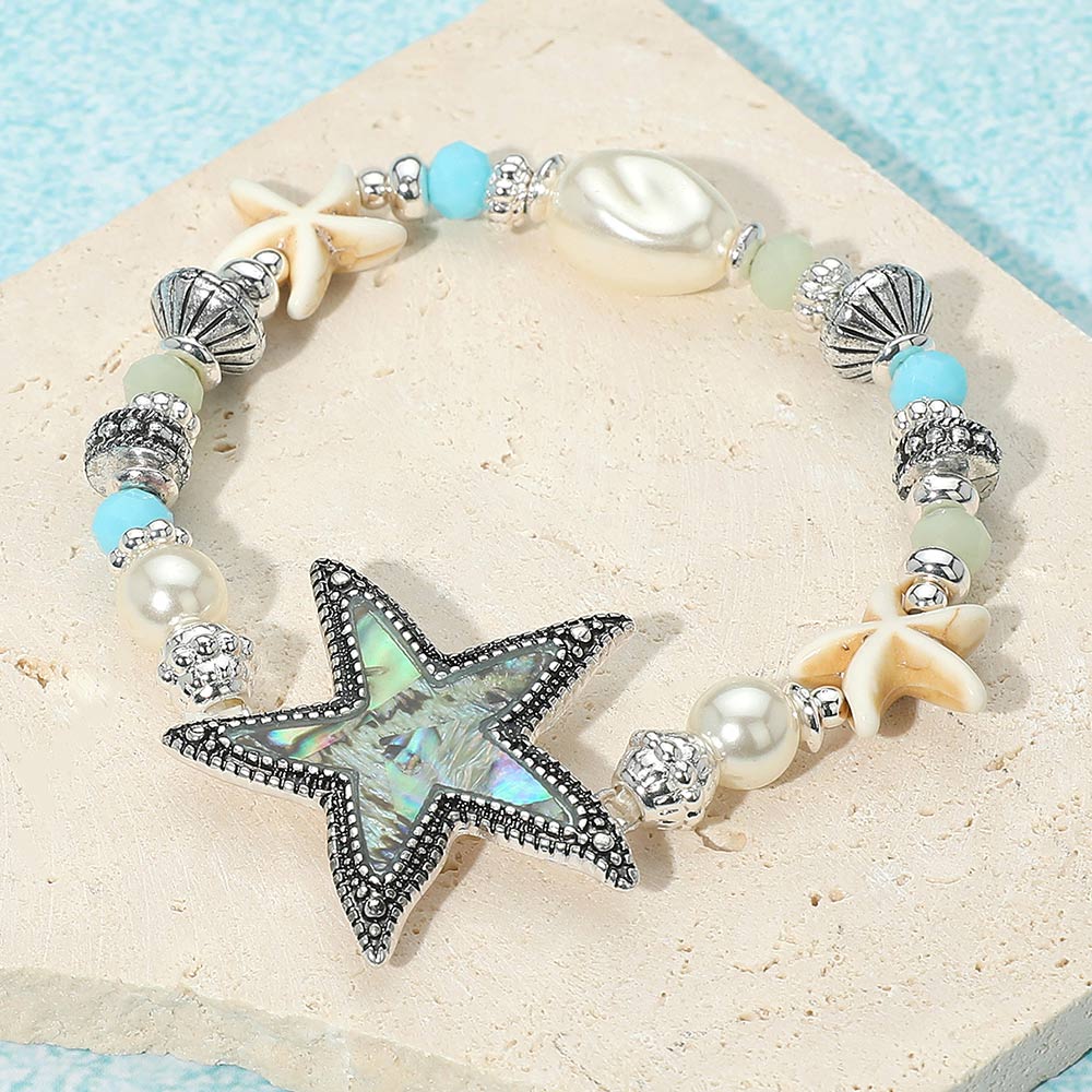 Abalone Antique Metal Starfish Pearl Beaded Stretch Bracelet