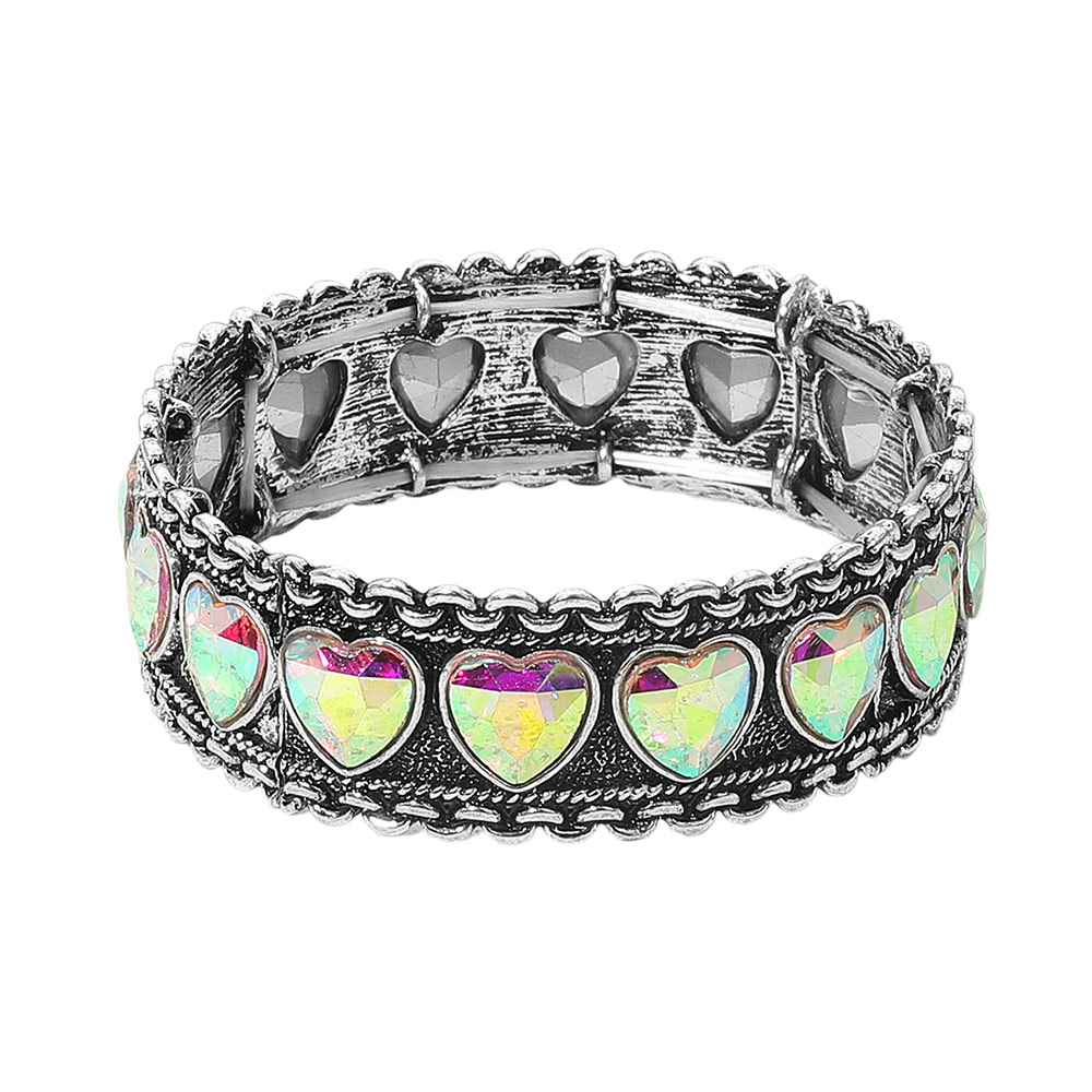 Details • Size : 0.75" H • Stretchable • Shine with this vintage-inspired bracelet featuring iridescent heart accents. Its adjustable stretch design ensures a comfortable fit while adding a touch of romance and sparkle to any outfit. A perfect choice for gifting or elevating everyday style. • Lead and Nickel Compliant