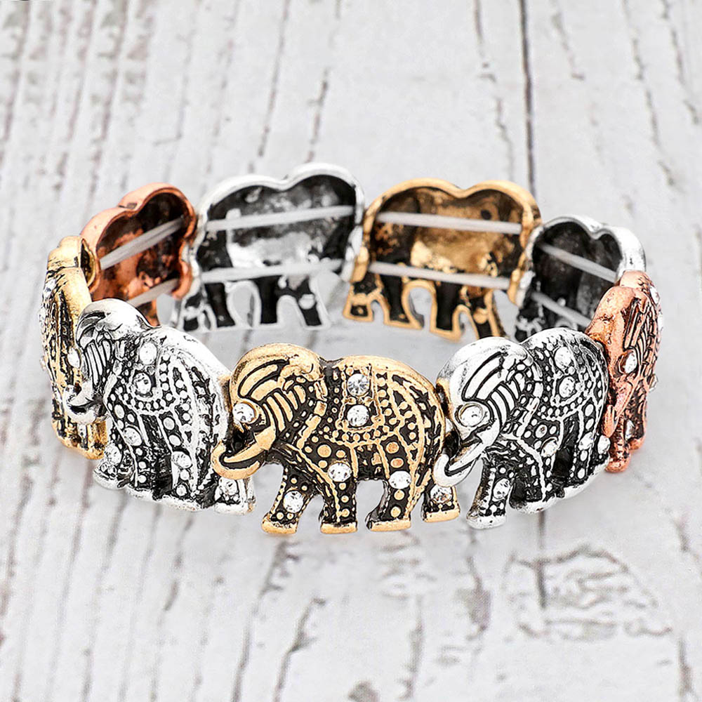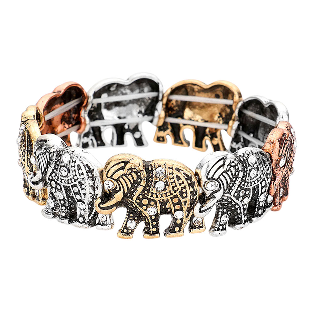 Details • Size : 0.75" H • Stretchable • Charming stretch bracelet featuring linked elephant motifs with engraved accents, symbolizing luck and strength. A unique accessory that adds personality and boho flair to any look, perfect for gifting or wearing as a meaningful everyday statement piece. • Lead and Nickel Compliant