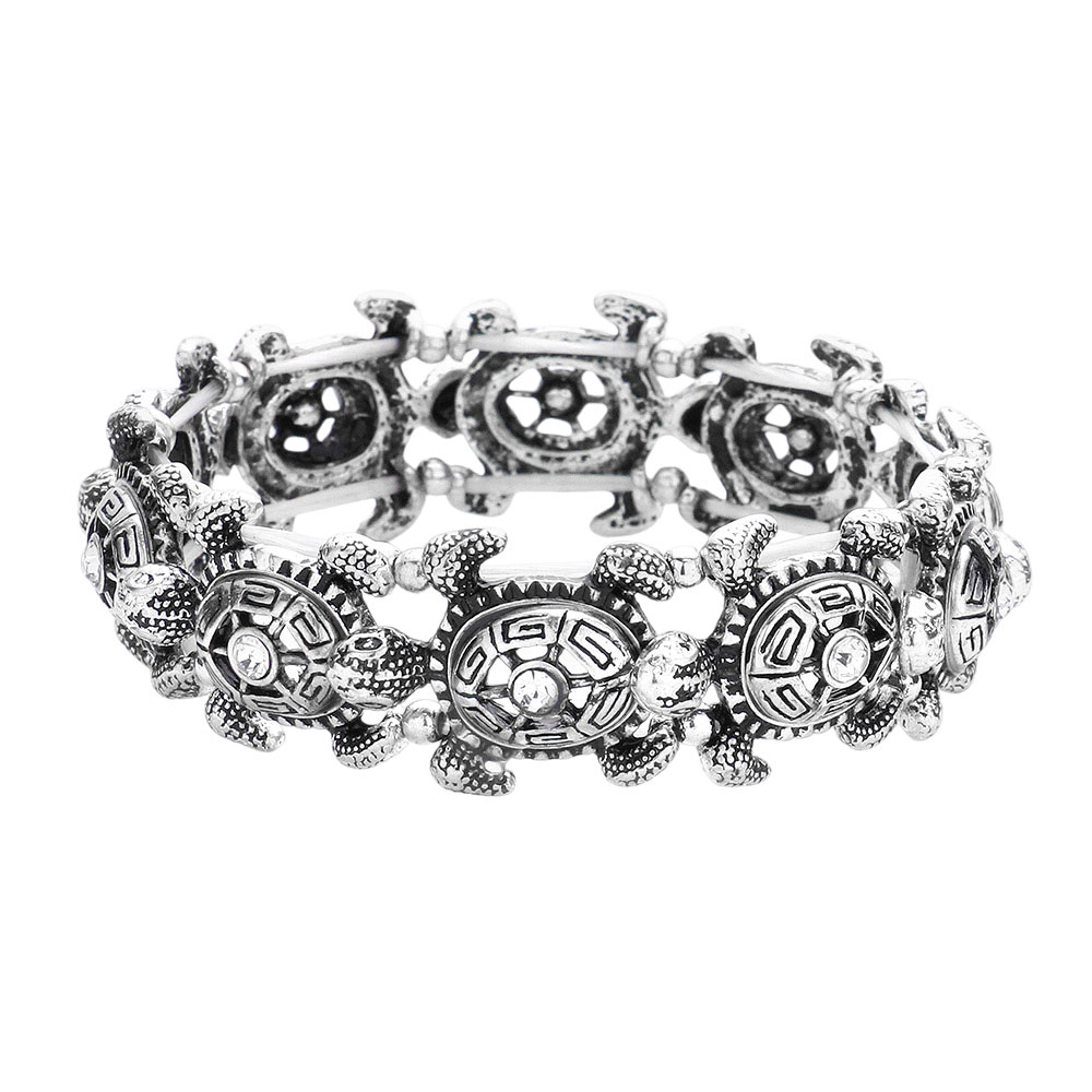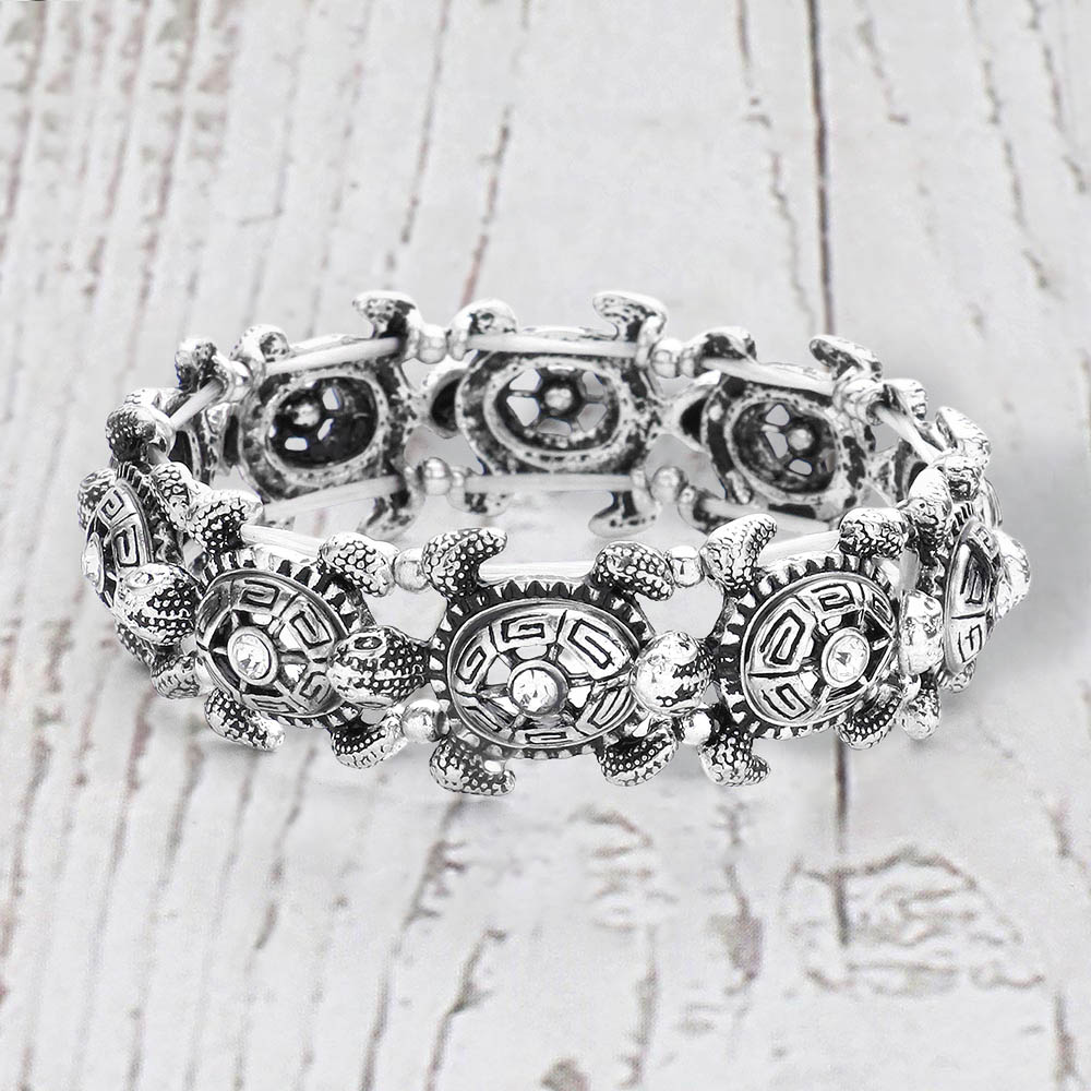 Antique Metal Stone Centered Turtle Link Stretch Bracelet