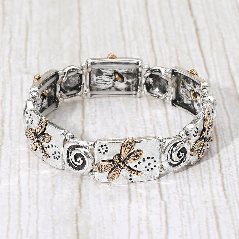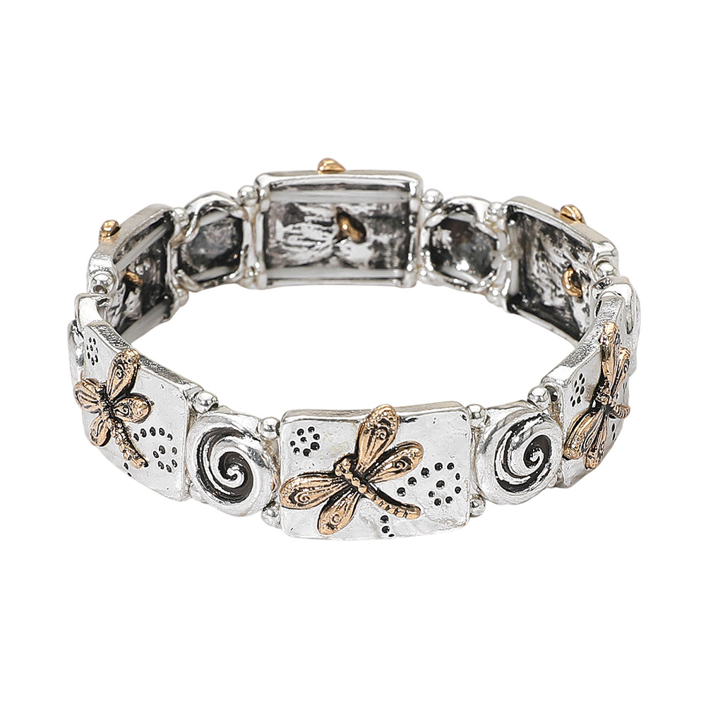 • Embrace artistic elegance with this dragonfly and swirl pattern stretch bracelet, crafted with intricate raised detailing and a smooth, comfortable fit. Its nature-inspired motif and mixed metallic accents add timeless charm, making it a standout accessory for both everyday and special wear.