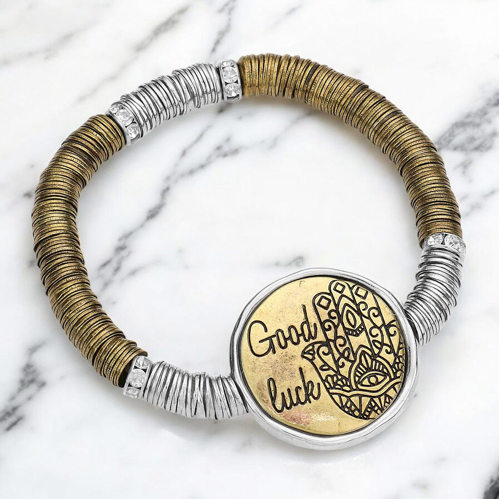 "Good luck" Evil Eye Hamsa Hand Flat Metal Bead Cluster Stretch Bracelet