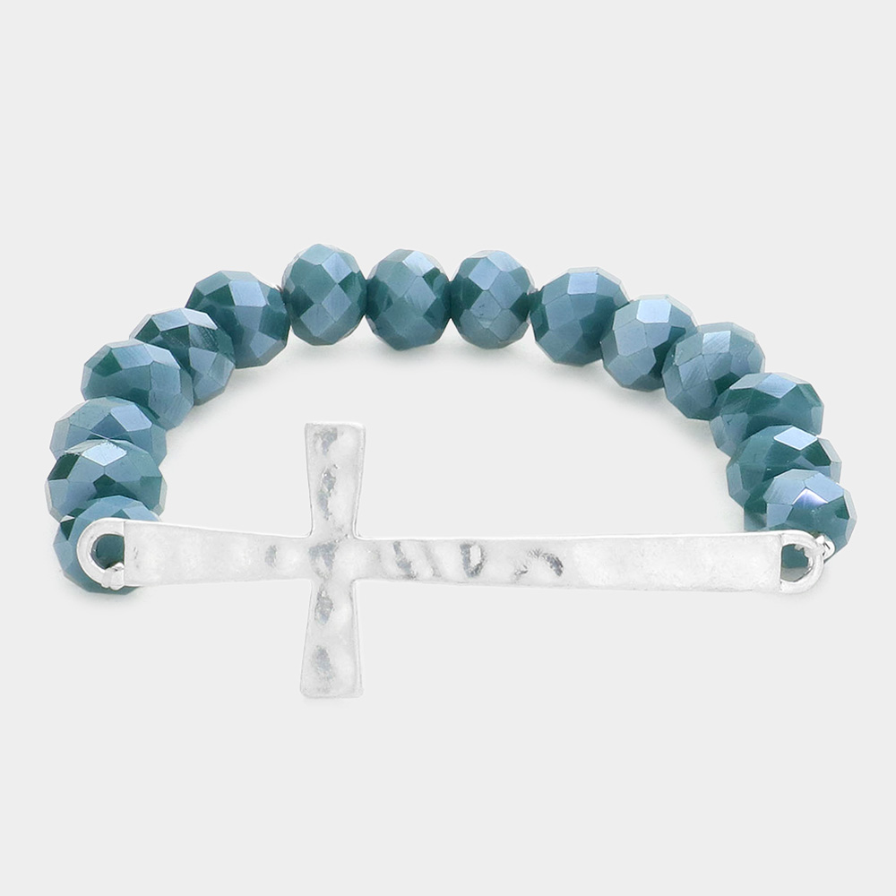 Hammered Metal Cross Accented Faceted Beads Stretch Bracelet