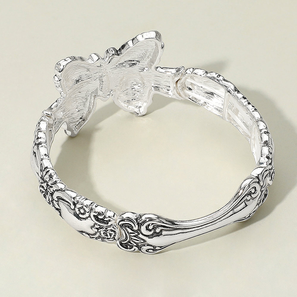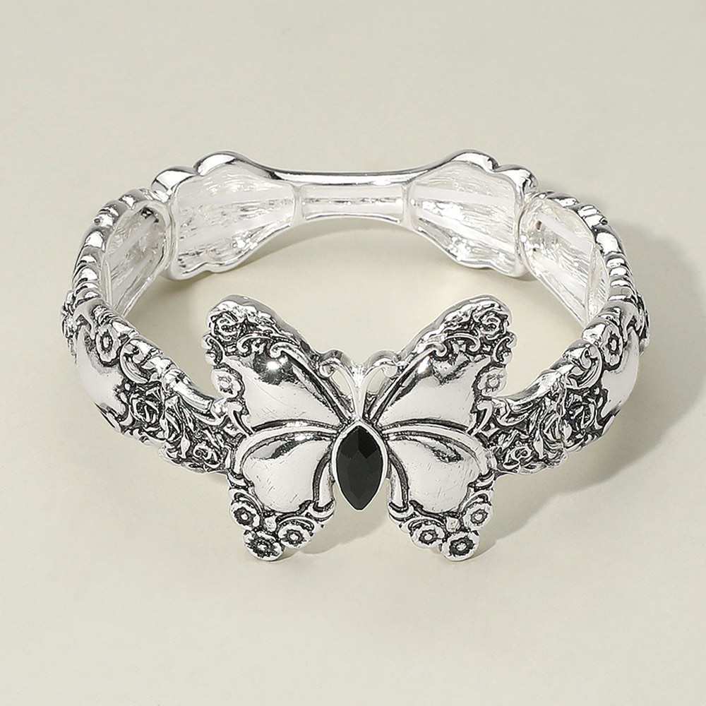Details • Size : 1.25" H • Stretchable • Add a whimsical touch to your look with this vintage-inspired stretch bracelet featuring an intricately designed butterfly centerpiece and ornate floral accents. Comfortable and stylish, it’s a versatile accessory perfect for casual wear or adding charm to any outfit. • Lead and Nickel Compliant