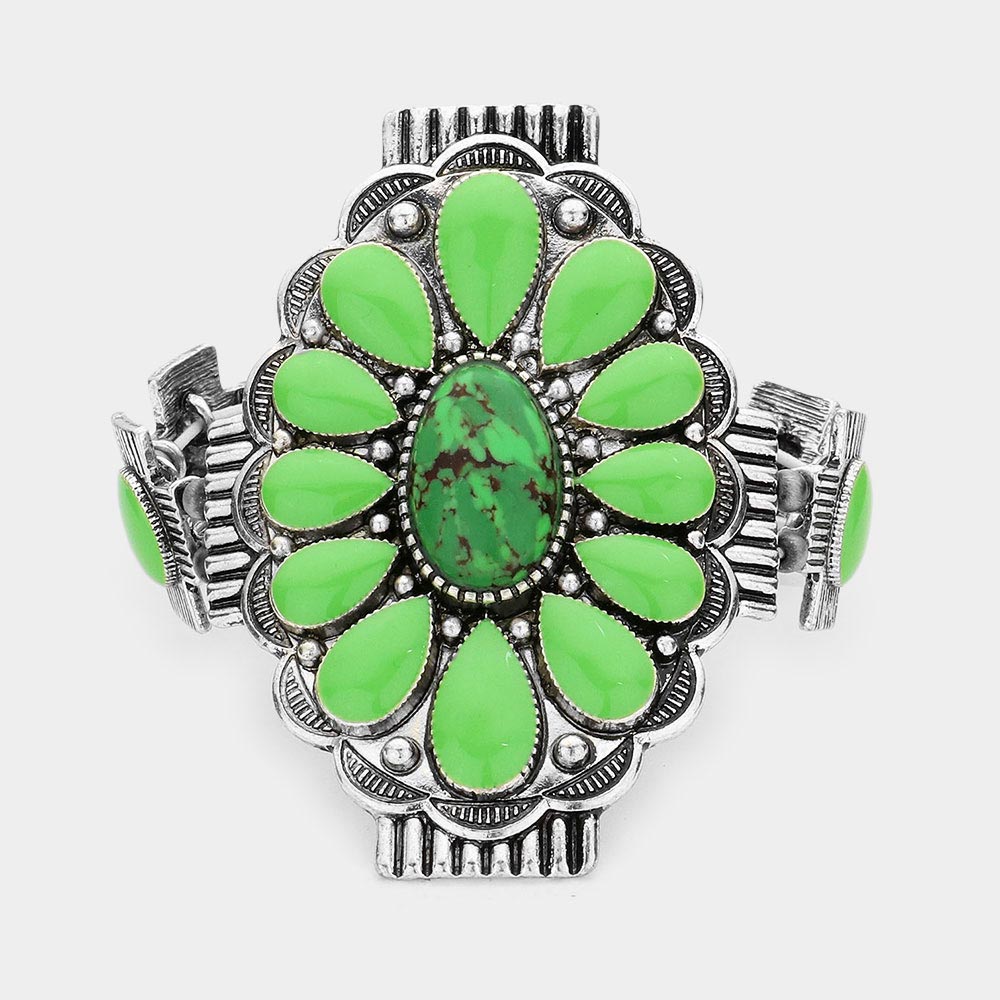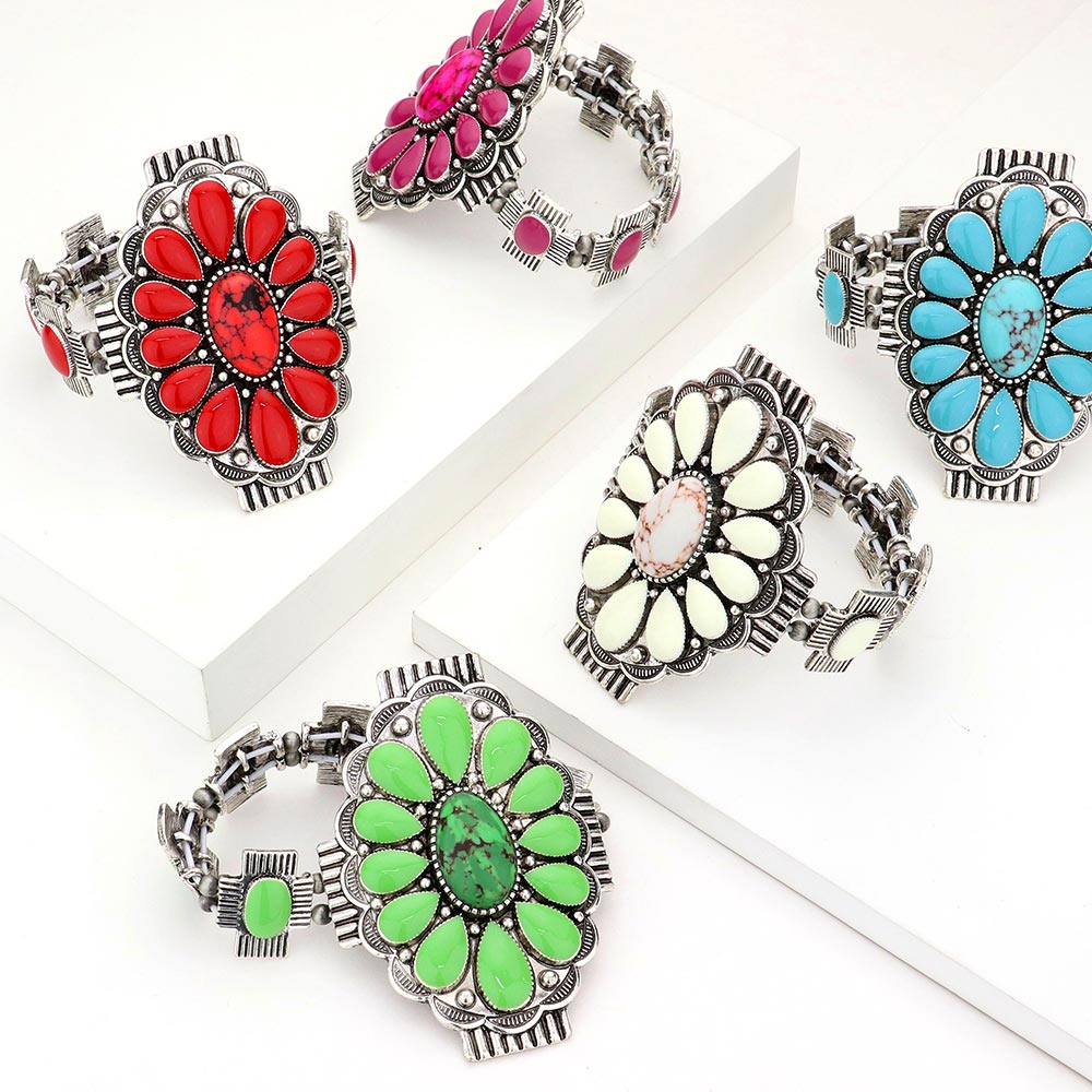 Natural Stone Accented Flower Burnished Metal Stretch Bracelet