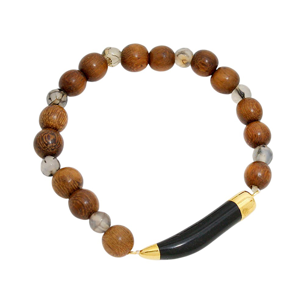 Natural stone horn tusk & wood pearl strand stretch bracelet