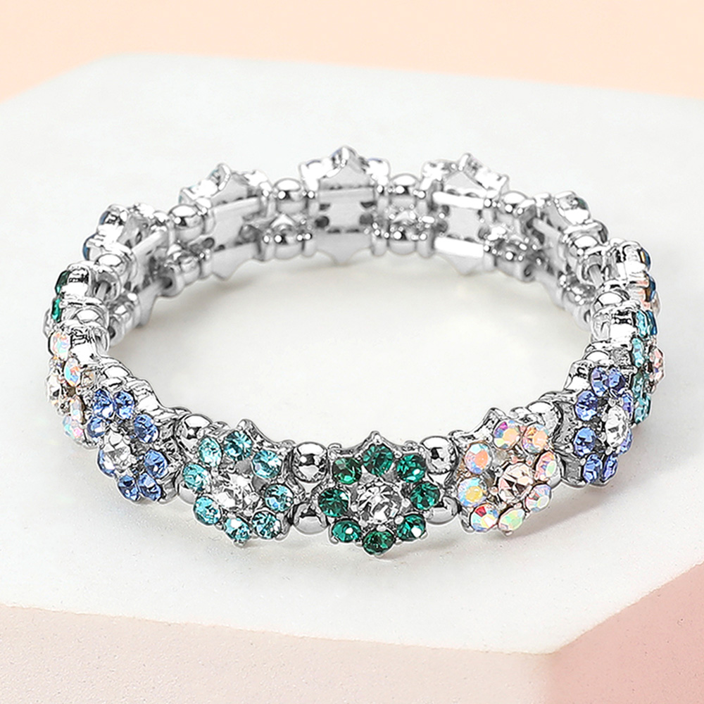 Details • Size : 0.5" H • Stretchable • Enhance your jewelry collection with this silver tone floral bracelet featuring dazzling multicolor gem clusters. Its intricate flower design adds a charming and feminine touch, making it perfect for special occasions or adding a vibrant accent to your everyday style. • Lead and Nickel Compliant