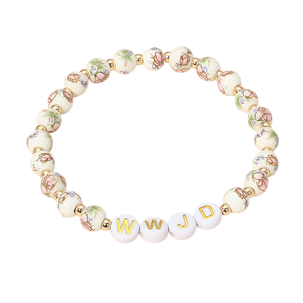 WWJD Message Floral Ceramic Ball Beaded Stretch Bracelet