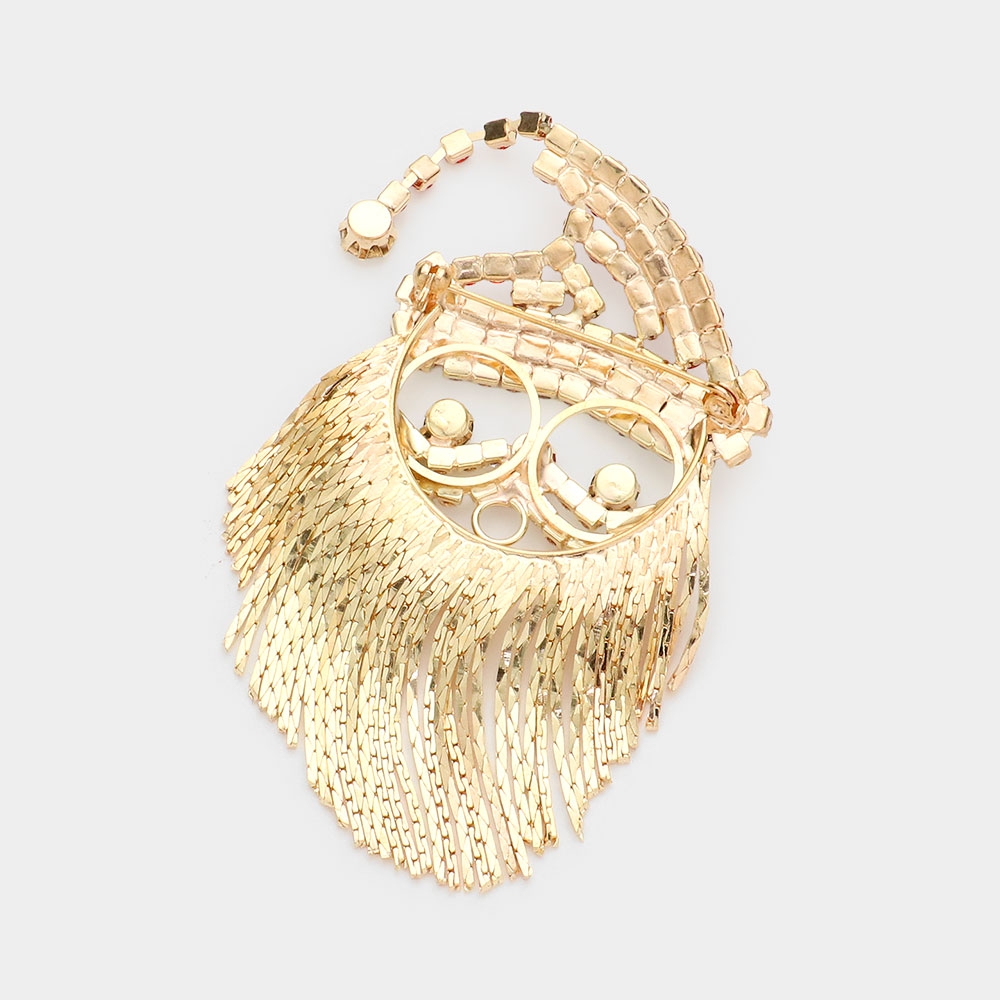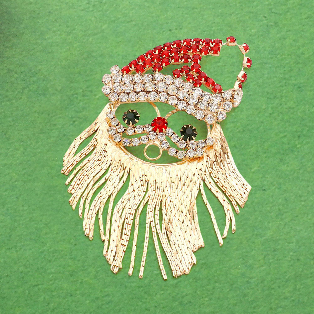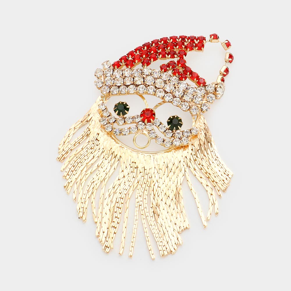 Details • Size : 2" X 3.25" • Pin Brooch • Bring festive sparkle to your outfit with this radiant Santa brooch adorned with dazzling rhinestones and a playful fringe beard. Perfect for holiday gatherings, parties, or gifting, this charming accessory adds joyful cheer and timeless sparkle to any winter look. • Lead and Nickel Compliant