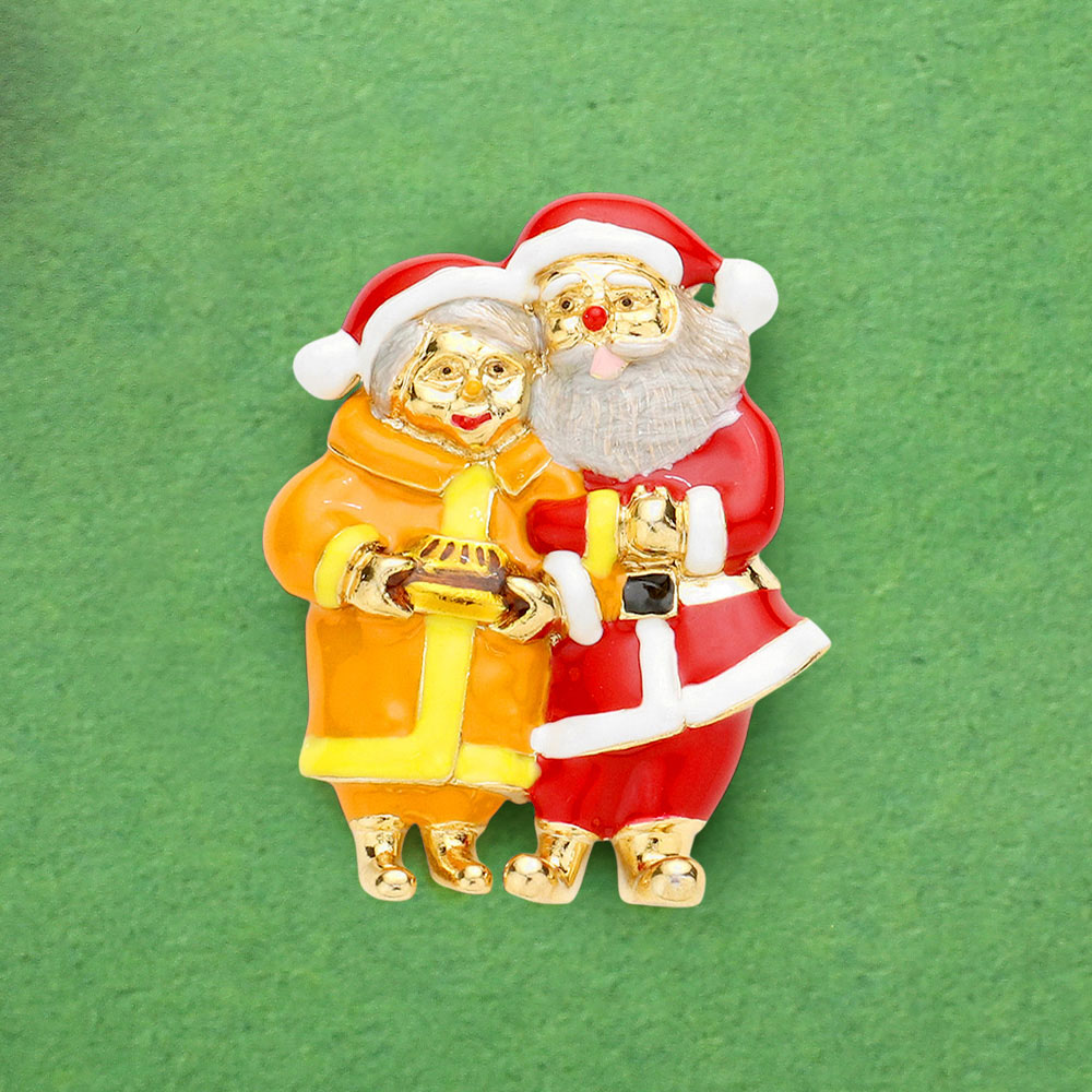 • Celebrate the season with this adorable Mr. and Mrs. Claus brooch, perfect for holiday outfits or festive accessories. Features a cheerful couple in classic attire, adding charm to any look or gift idea.