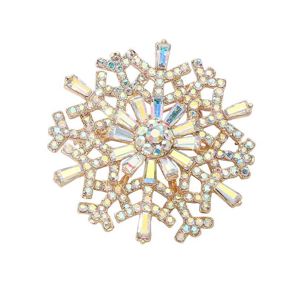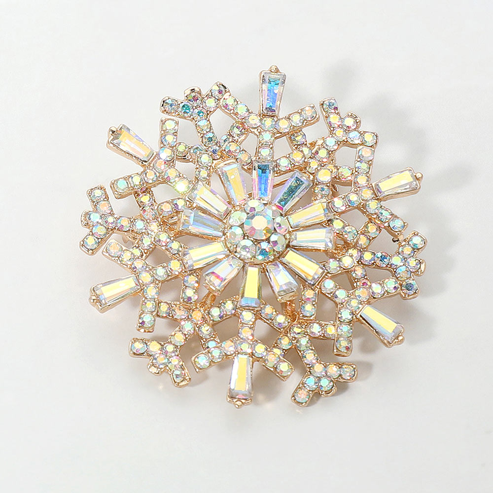 Details • Size : 2" X 2" • Pin Brooch • Shimmer in winter elegance with this snowflake brooch adorned with iridescent crystals and intricate detailing. A radiant accessory that captures light beautifully, perfect for festive outfits, seasonal events, or adding frosty sparkle to everyday looks. • Lead and Nickel Compliant