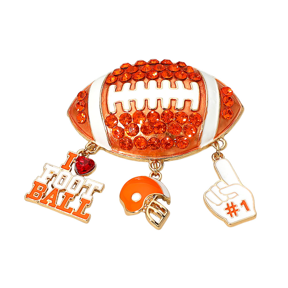• Sporty football brooch featuring rhinestone football design with dangling charms including helmet, #1 foam finger, and “I Love Football.” Perfect accessory for gameday outfits, tailgates, or fan gear.