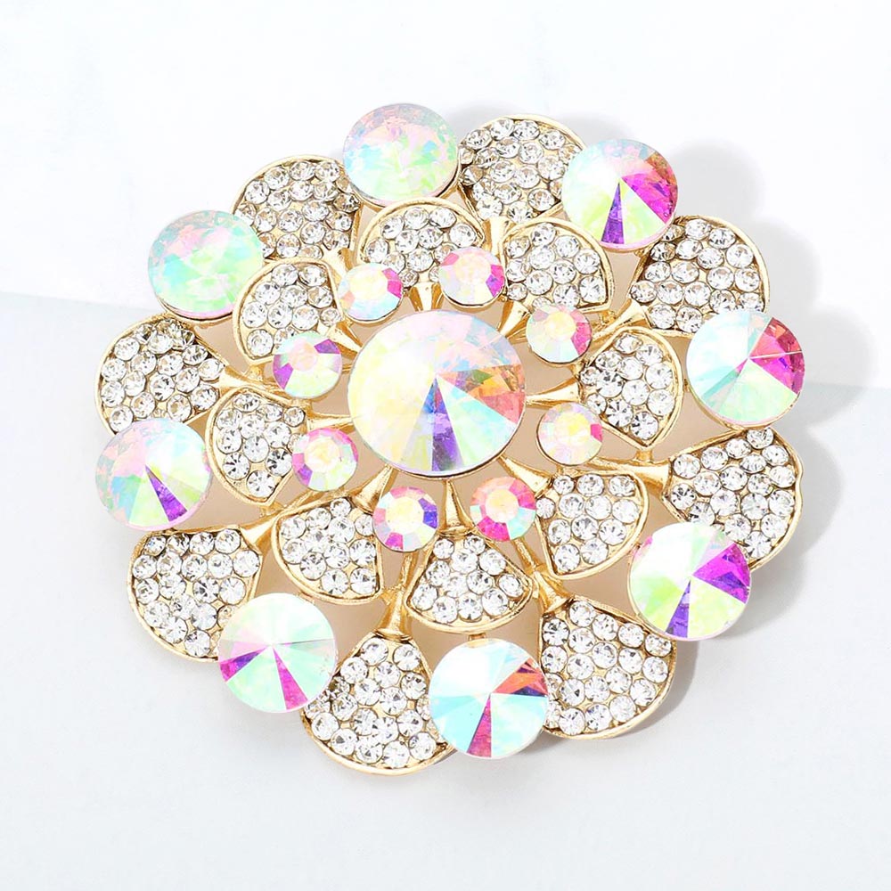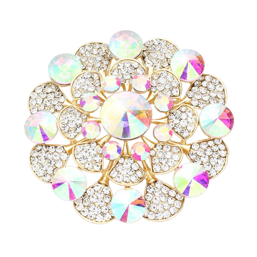 Details • Size : 3" X 3" • Pin Brooch • This stunning round crystal flower brooch features layered gem accents that create a dazzling floral design. Perfect for elevating any outfit, it adds a touch of vintage-inspired glamour and refined brilliance to jackets, scarves, or formal attire. • Lead and Nickel Compliant