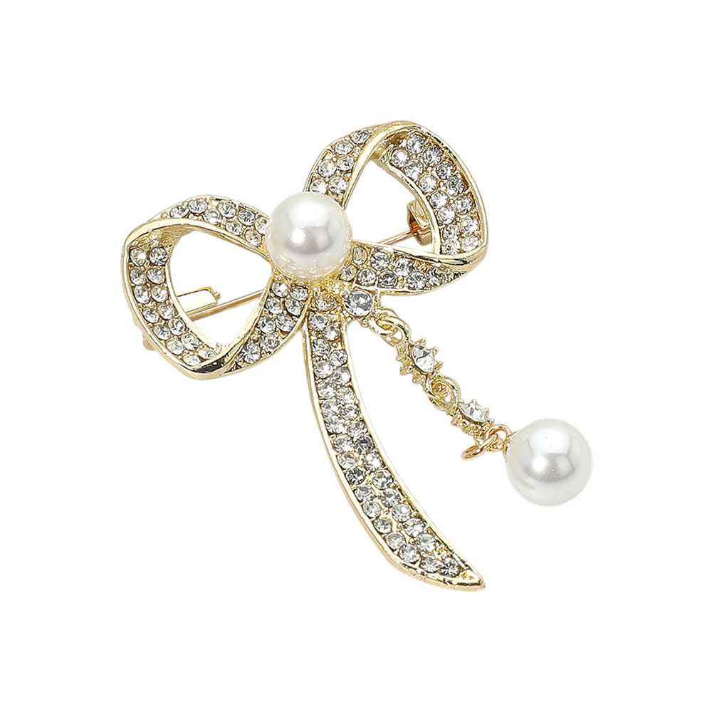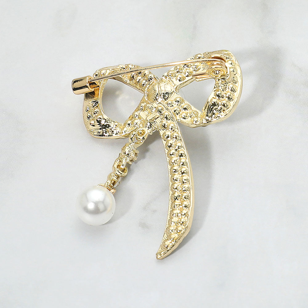 Details • Size : 1.4" X 1.8" • Pin Brooch • Graceful bow brooch featuring sparkling crystal accents and a delicate pearl drop. A versatile accessory to elevate blouses, jackets, dresses, or scarves with timeless elegance, perfect for both everyday style and special occasions. • Lead and Nickel Compliant