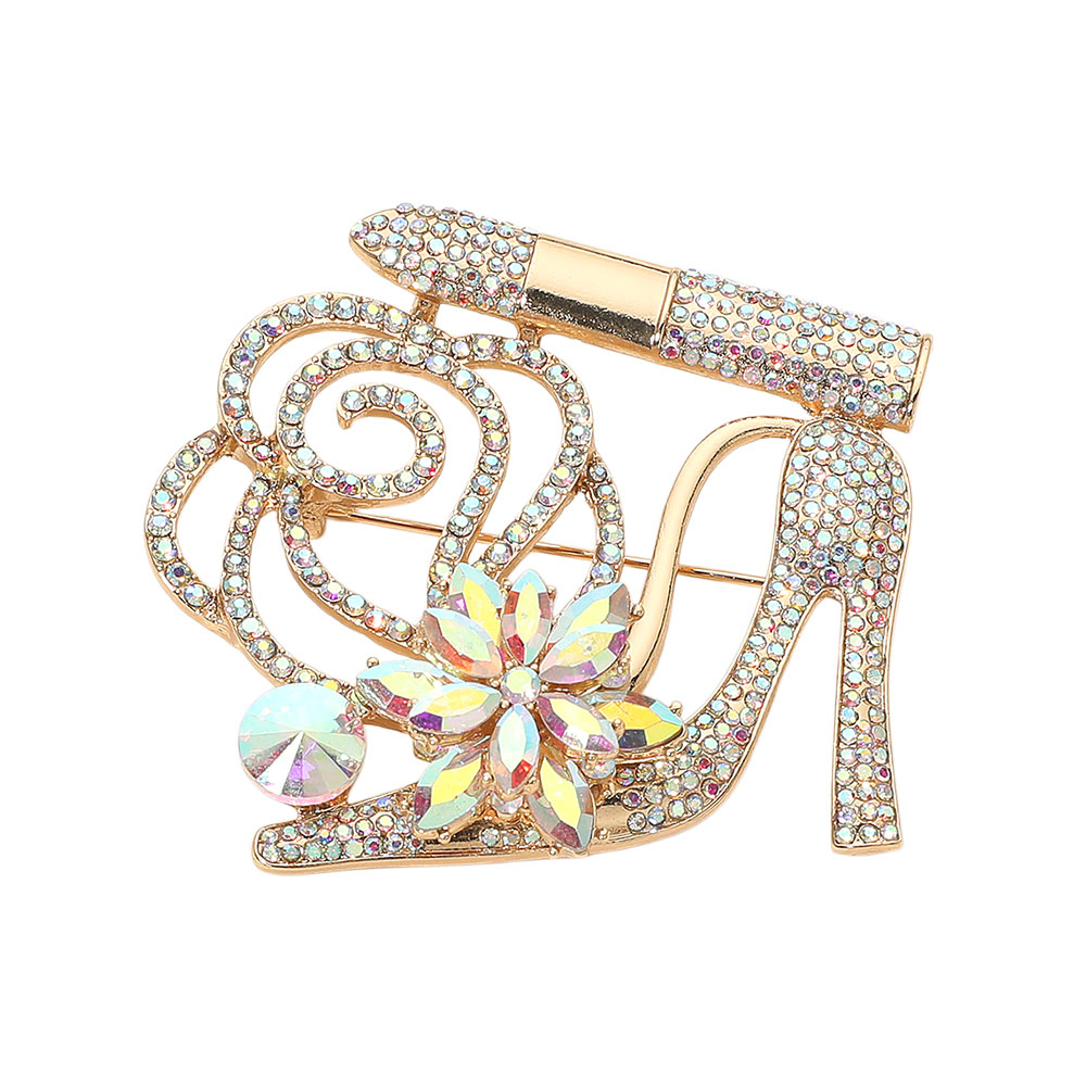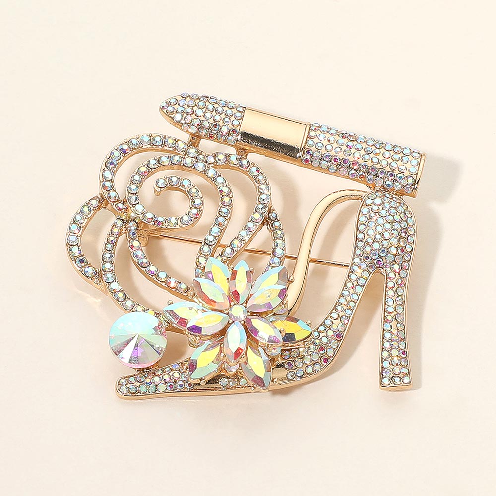 Details • Size : 2.5" X 2.4" • Pin Brooch • Glamorous brooch featuring a high heel, lipstick, floral accents, and sparkling crystals. A bold statement accessory perfect for adding flair to jackets, scarves, or bags. Ideal for special occasions or gifting with a touch of fashion-forward fun. • Lead and Nickel Compliant