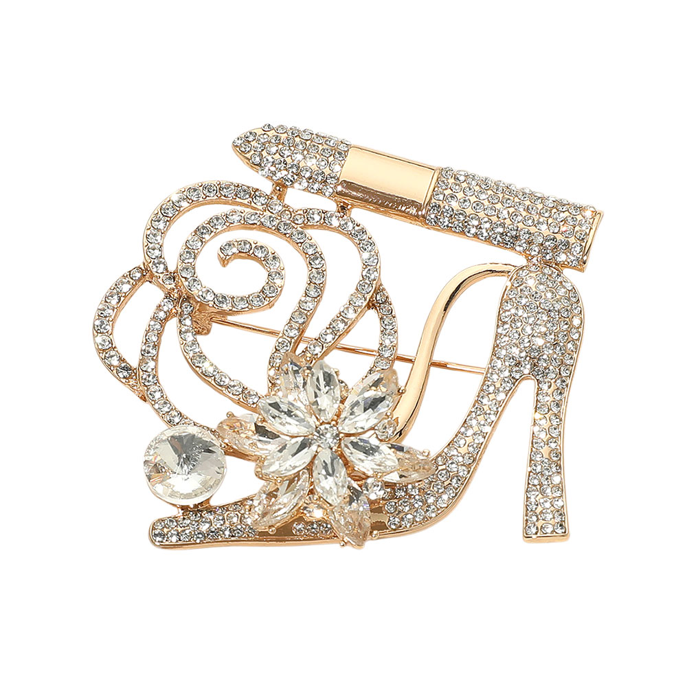 Details • Size : 2.5" X 2.4" • Pin Brooch • Glamorous brooch featuring a high heel, lipstick, floral accents, and sparkling crystals. A bold statement accessory perfect for adding flair to jackets, scarves, or bags. Ideal for special occasions or gifting with a touch of fashion-forward fun. • Lead and Nickel Compliant